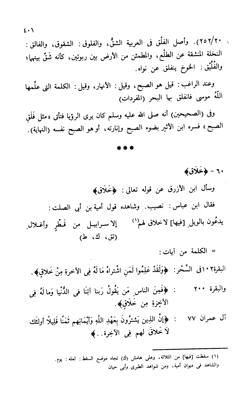 20 / 252) . وأصل الفلْق في العربية الشقُّ، والفلوق: الشقوق، والفالق: النخلة المنشقة عن الطلْع، والمطمئن من الأرض بين ربوتين، كأنه شَقٌ بينهما؛ والفُلَّيْق: الخوخ ينفلق عن نواه.