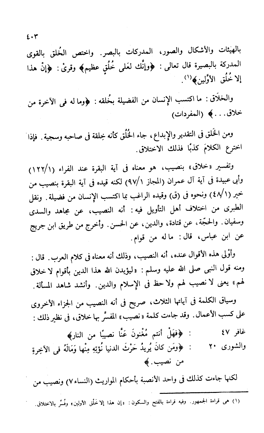 وتفسير "خلاق" بنصيب، هو معناه في آية البقرة عند الفراء (1 / 122) وأبي عبيدة في آية آل عمران (المجاز 1 / 97) لكنه قيده في آية البقرة بنصيب من خير (1 / 48) ومحوه في (ق) وقيده الراغب بما اكتسب الإنسان من فضيلة. ونقل الطبري من اختلاف أهل التأويل فيه: أنه النصيب، عن مجاهد والسدى وسفيان. والحجّة، عن قتادة، والدين، عن الحسن. وأخرج من طريق ابن جريج عن ابن عباس، قال: ما له من قوام.