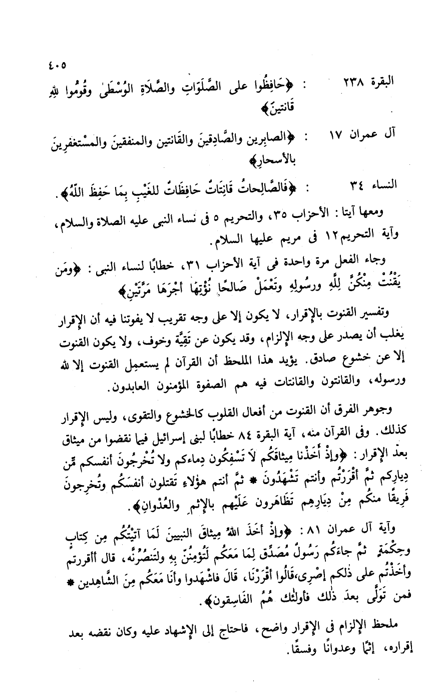 وتفسير القنوت بالإقرار لا يكون إلا على وجه تقريب لا يفوتنا فيه أن الإقرار يغلب أن يصدر على وجه الإلزام، وقد يكون عن تَقِيَّة وخوف، ولا يكون القنوت إلا عن خشوع صادق. يؤيد هذا الملحظ أن القرآن لم يستعمل القنوت إلا لله ورسوله، والقانتون والقانتات فيه هم الصفوة المؤمنون العابدون.