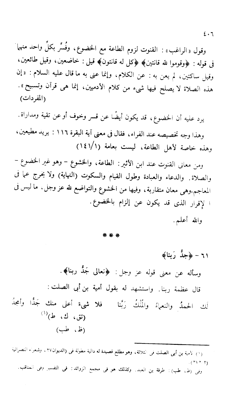 وقول "الراغب": القنوت لزوم الطاعة مع الخضوع، وفُسرَّ بكلَّ زاحد منهما في قوله: {وَقُومُوا لِلَّهِ قَانِتِينَ} {كُلٌّ لَهُ قَانِتُونَ} قيل: خاضعين، وقيل طائعين، وقيل ساكتين، لم يعن به: عن الكلام، وإنما عنى به ما قال عليه السلام: "إن هذه الصلاة لا يصلح فيها شيء من كلام الآدميين، إنما هي قرآن وتسبيح". (المفردات)