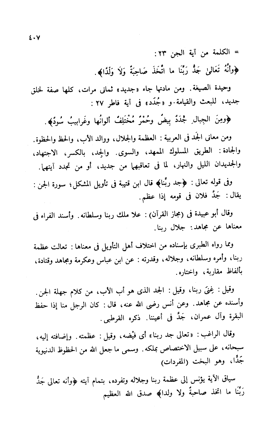 وقال الراغب: "تعالى جد ربنا" أي فيْضه، وقيل: عظمته. وإضافته إليه، سبحانه، على سبيل الاختصاص بملكه. وسمى ما جعل الله من الحظوظ الدنيوية جَداً، وهو البخت (المفردات)