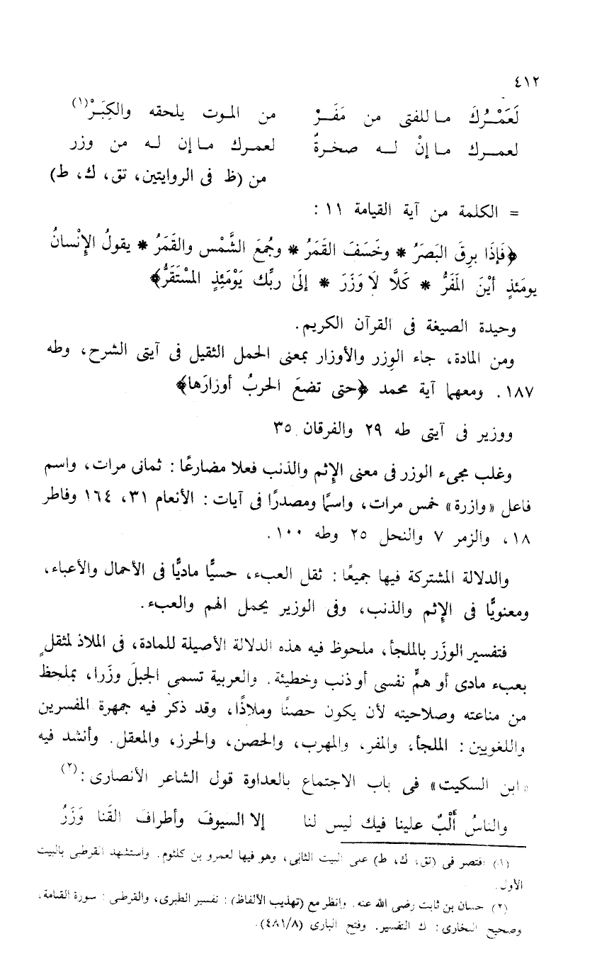 فتفسير الوزَر بالملجأ، ملحوظ فيه هذه الدلالة الأصلية للمادة، في الملاذ لمثقلٍ بعبء مادي أو همَّ نفسي أو نذب وخطيئة. والعربية تسمى الجبلَ وزَرا، بملحظ من مناعته وصلاحيته لأن يكون صحناً وملاذاً، وقد ذكر فيه جمهرة المفسرين واللغويين: الملجأ، والمفر، والمهرب، والحصن، والحرز، والمعقل. وأنشد فيه "ابن السكيت" في باب الاجتماع بالعداوة قول الشاعر الأنصاري: