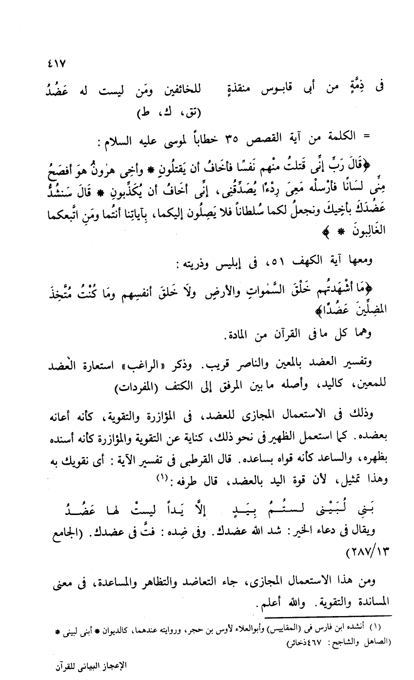وتفسير العضد بالمعين والناصر قريب. وذكر "الراغب" استعارة العضد للمعين، كاليد، وأصله ما بين المرفق إلى الكتف (المفردات)