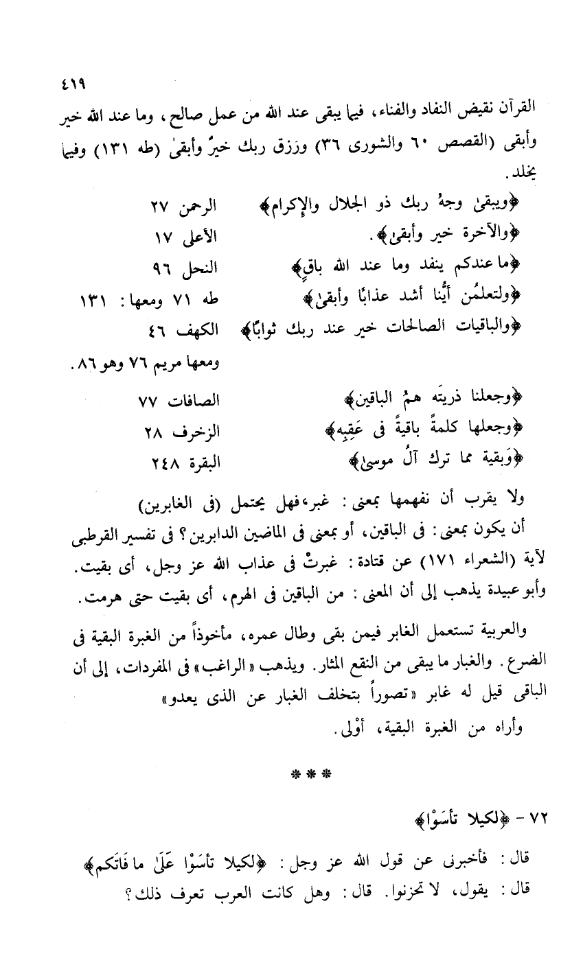 القرآن نقيض النفاد والفناء، فيما يبقى عند الله من عمل صالح، وما عند الله خير وأبقى (القصص 60 والشورى 36) ورَزق ربك خيرٌ وأبقى (طه 131) وفيما يخلد.