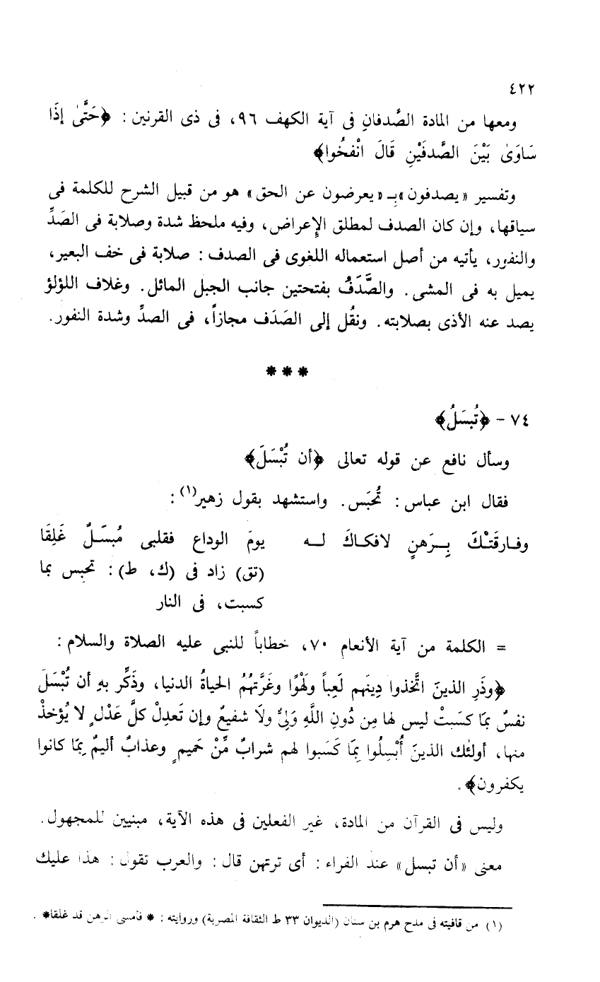وليس في القرآن من المادة، غير الفعلين في هذه الآية، مبنيين للمجهول. ومعنى {أَنْ تُبْسَلَ} عند الفراء: أي ترتهن قال: والعرب تقول: هذا عليك
