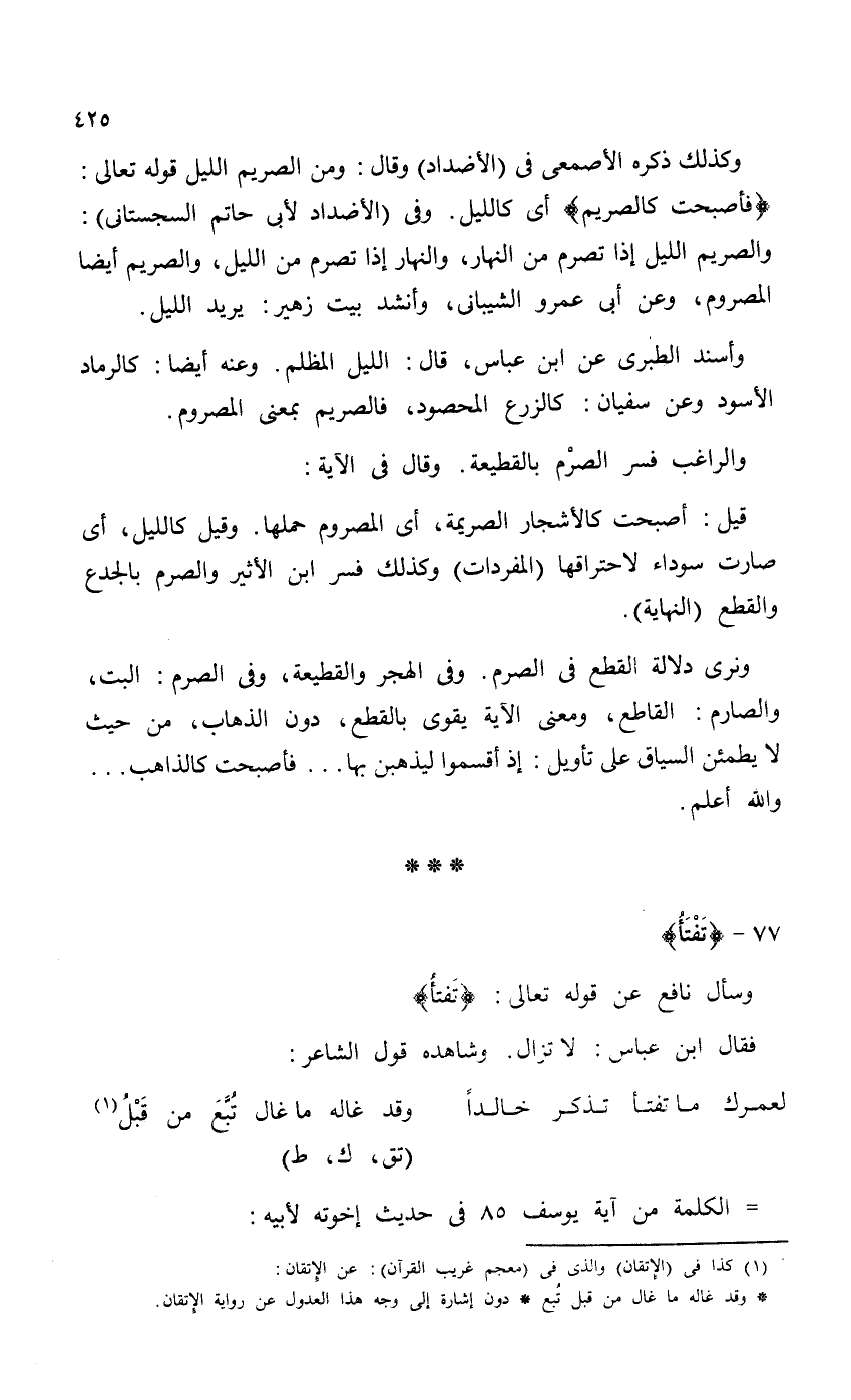 وكذلك ذكره الأصمعي في (الأضداد) وقال: ومن الصريم الليل قوله تعالى: {فَأَصْبَحَتْ كَالصَّرِيمِ} أي كالليل. وفي (الأضداد لأبي حاتم السجستاني) : والصريم الليل إذا تصرم من النهار، والنهار إذا تصرم من الليل، والصريم أيضاً المصروم، وعن أبي عمرو الشيباني، وأنشد بيت زهير: يريد الليل.