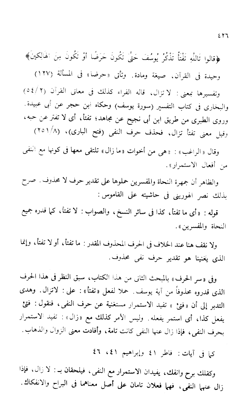 وفي "ير الخوف" بالمبحث من هذا الكتاب، سبق النظر في هذا الحرف الذي قدروه محذوفاً من آية يوسف. حملاً لفعل "تفتأ": على: لا تزال. وهدى التدبر إلى أن "فتئ" تفيد الاستمرار مستغنية عن حرف النفي، فنقول: فتئ يفعل كذا، أي استمر يفعله. وليس الأمر كذلك مع "زال": تفيد الاستمرار بحرف النفي، فإذا زال عنها النفي كانت تامة، وأفادت معنى الزوال والذهاب.
