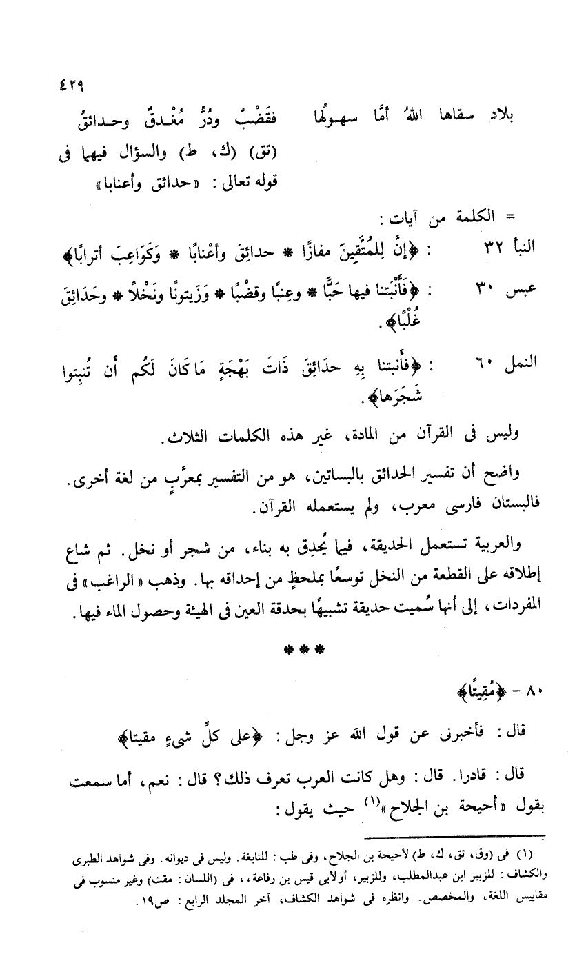 واضح أن تفسير الحدائق بالبساتين، هو من التفسير بمعرَّبٍ من لغة أخرى. فالبستان فارسي معرب، ولم يستعمله القرآن.