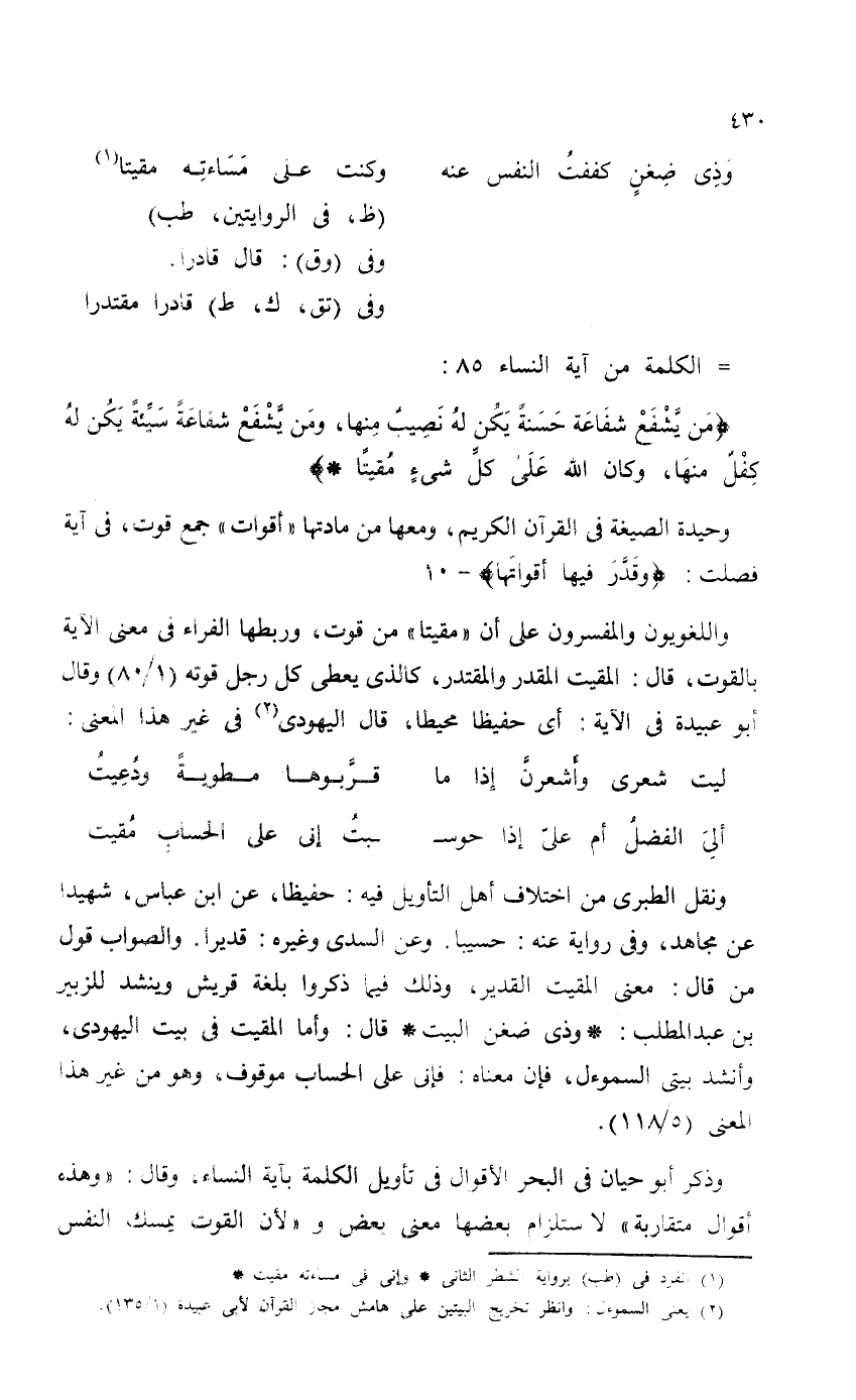 ونقل الطبري من اختلاف أهل التأويل فيه: حفيظاً، عن ابن عباس، شهيداً عن مجاهد، وفي رواية القدير، وذلك فيما ذكروا بلغة قريش وينشد للزبير بن عبد المطلب: * وذي ضغن البيت * قال: وأما المقيت في بيت اليهودي، وأنشد بيتي السموءل، فإن معناه: فإني على الحساب موقوف، وهو من غير هذا المعنى (5 / 118) .
