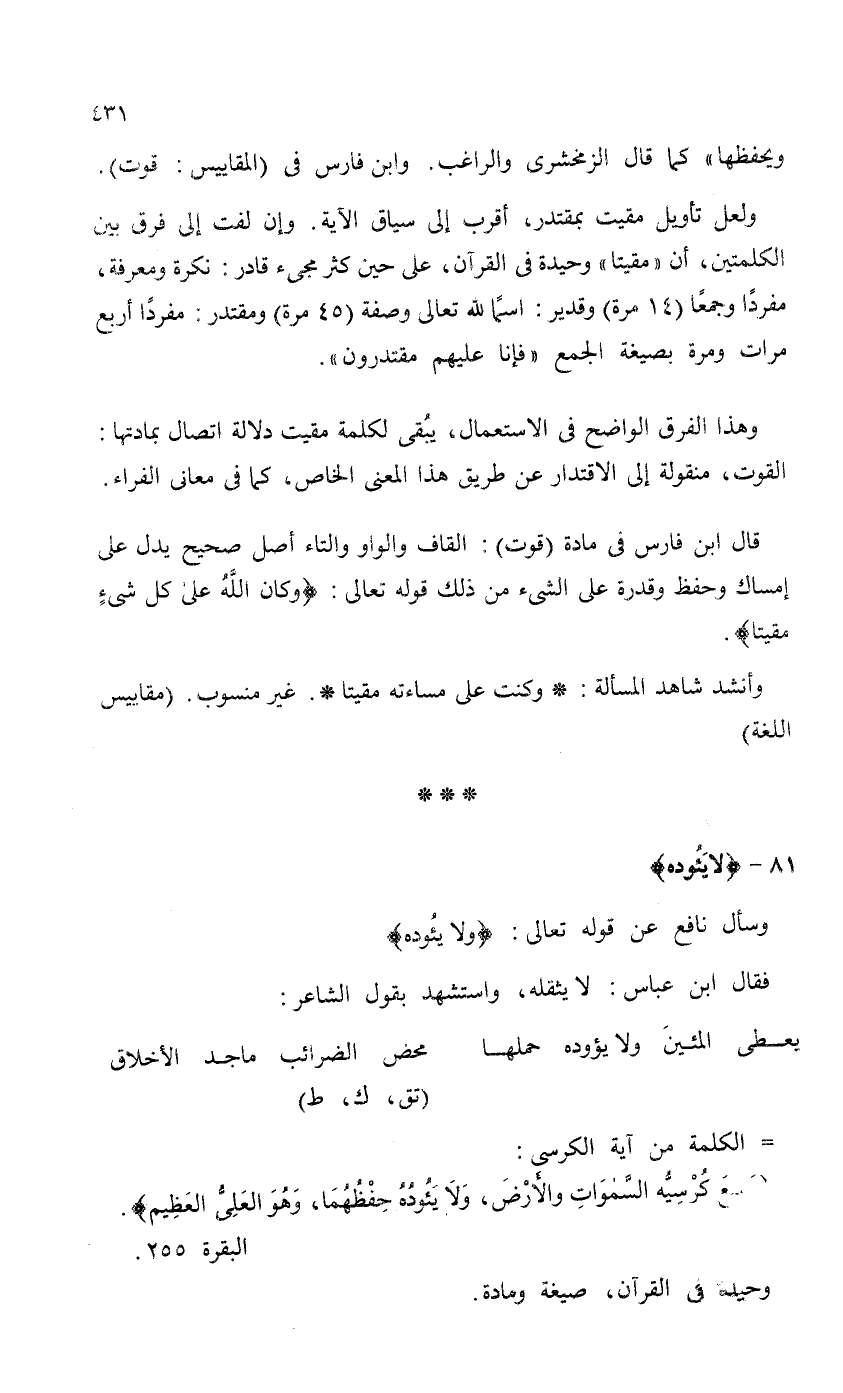 ولعل تأويل مقيت بمقتدر، أقرب إلى سياق الآية. وإن لفت إلى فرق بين الكلمتين، أن "مقيتا" وحيدة في القرآن، على حين كثر مجئ قادر: نكرة ومعرفة، مفرداً وجمعاً (14 مرة) وقدير: اسماً لله تعالى وصفة (45 مرة) ومقتدر: مفرداً أربع مرات ومرة بصيغة الجمع {فَإِنَّا عَلَيْهِمْ مُقْتَدِرُونَ} .