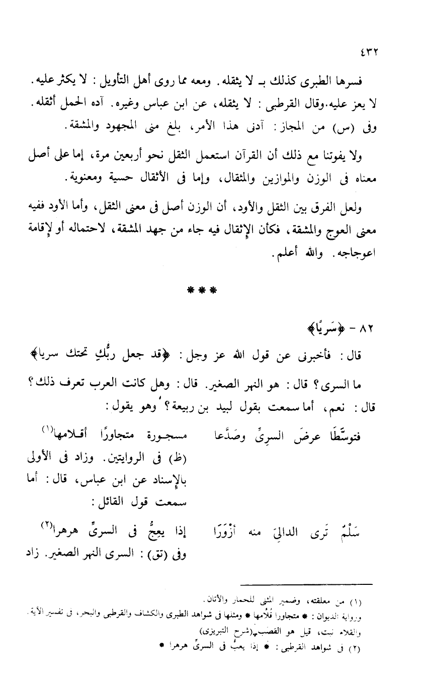 ما السرى؟ قال: هو النهر الصغير. قال: وهل كانت العرب تعرف ذلك؟ قال: نعم، أما سمعت بقول لبيد بن ربيعة؟ وهو يقول: