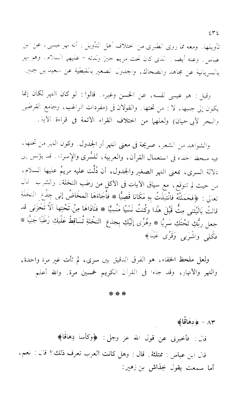 تأويلها. ومعه مما روى الطبري من اختلاف أهل التأويل: أنه نهر عيسى، عن ابن عباس. وعنه أيضاً: الذي كان تحت مريم حين ولدته - عليهما السلام. وهو نهر بالسريانية عن مجاهد والضحاك، والجدول الصغير بالقبطية عن سعيد بن جبير.