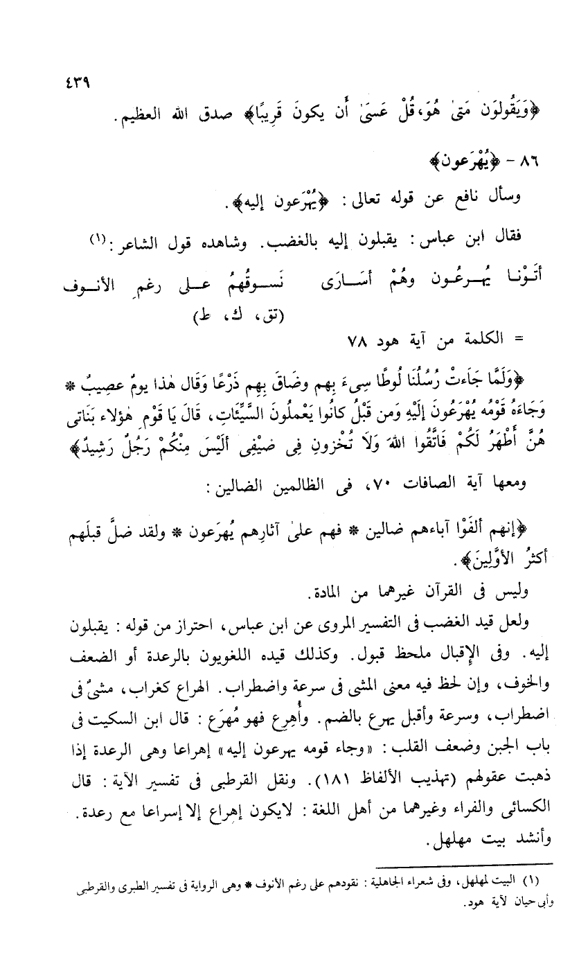 ولعل قيد الغضب في التفسير المروي عن ابن عباس، احتراز من قوله: يقبلون إليه. وفي الإقبال ملحظ قبول. وكذلك قيده اللغويون بالرعدة أو الضعف والخوف، وإن لحظ فيه معنى المشي في سرعة واضطراب. الهراغ كغراب، مشىٌ في اضطراب، وسرعة وأقبل يهرع بالضم. وأُهَرع فهو مُهرَع: قال ابن السكيت في باب الجبن وضعف القلب: "وجاء قومهم يهرعون إليه" إهراعاً وهي الرعدة إذا ذهبت عقولهم (تهذيب الألفاظ 181) . نقل القرطبي في تفسير الآية: قال الكسائي والفراء وغيرهما من أهل اللغة: لا يكون إهراع إلا إسراعاً مع رعدة. وأنشد بيت مهلهل.