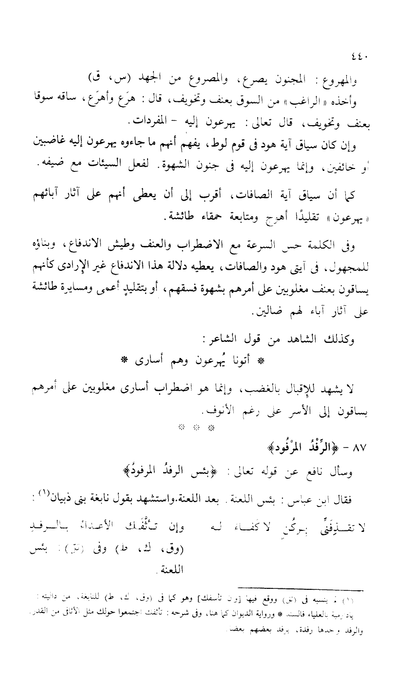 وفي الكلمة حس السرعة مع الاضطراب والعنف وطيش الاندفاع، وبناؤه للمجهول، في آيتى هود والصافات، يعطيه دلالة هذا الاندفاع غير الإرادي كأنهم يساقون بعنف مغلوبين على أمرهم بشهوة فسقهم، أو بتقليدٍ أعمى ومسايرة طائشة على آثار آباء لهم ضالين.