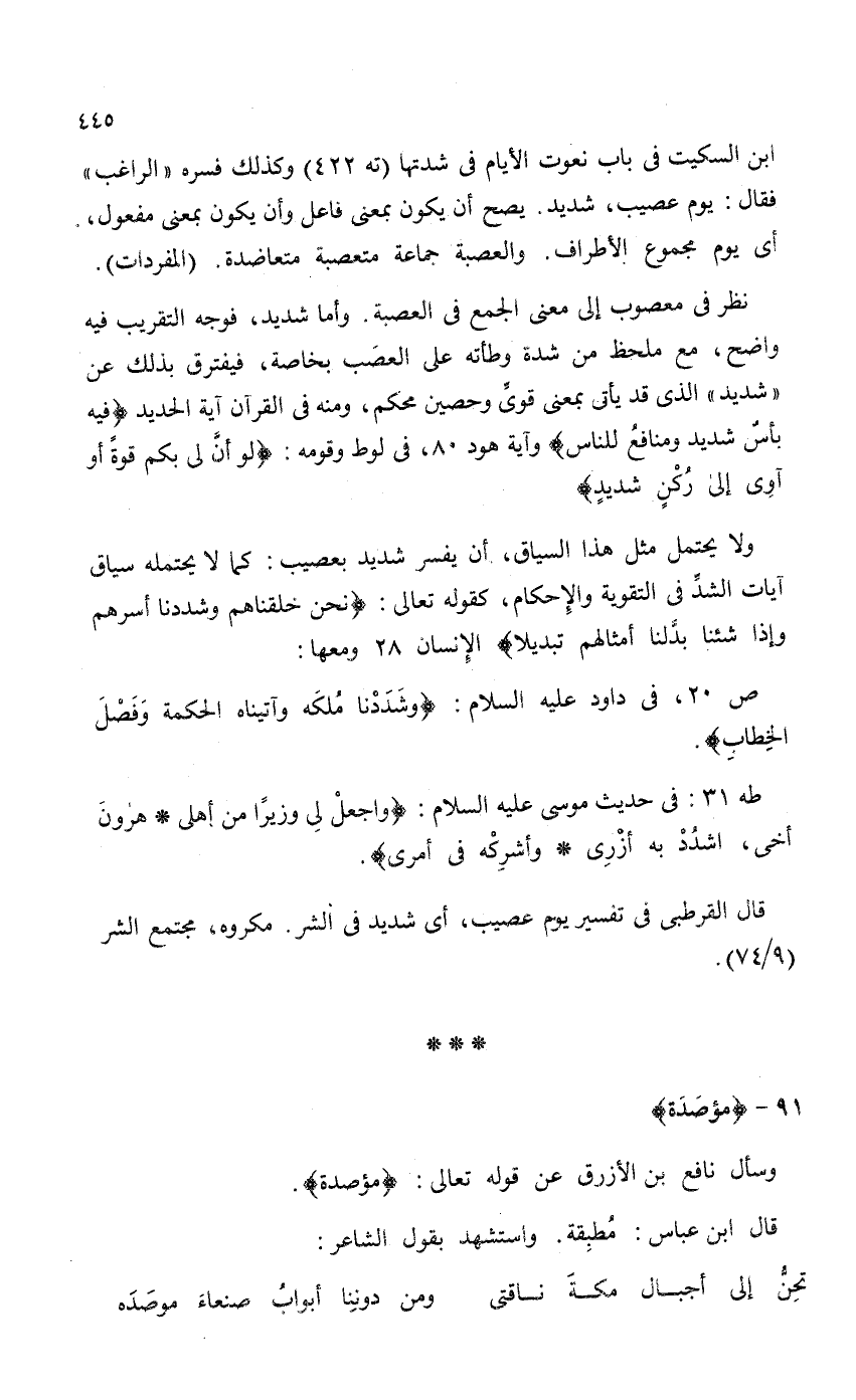 ابن السكيت في باب نعوت الأيام في شدتها (ته 422) وكذلك فسره "الراغب" فقال: يوم عصيب، شديد. يصح أن يكون بمعنى فاعل وأن يكون بمعنى مفعول، أي يوم مجموع الأطراف. والعصبة جماعة متعصبة متعاضدة. (المفردات) .