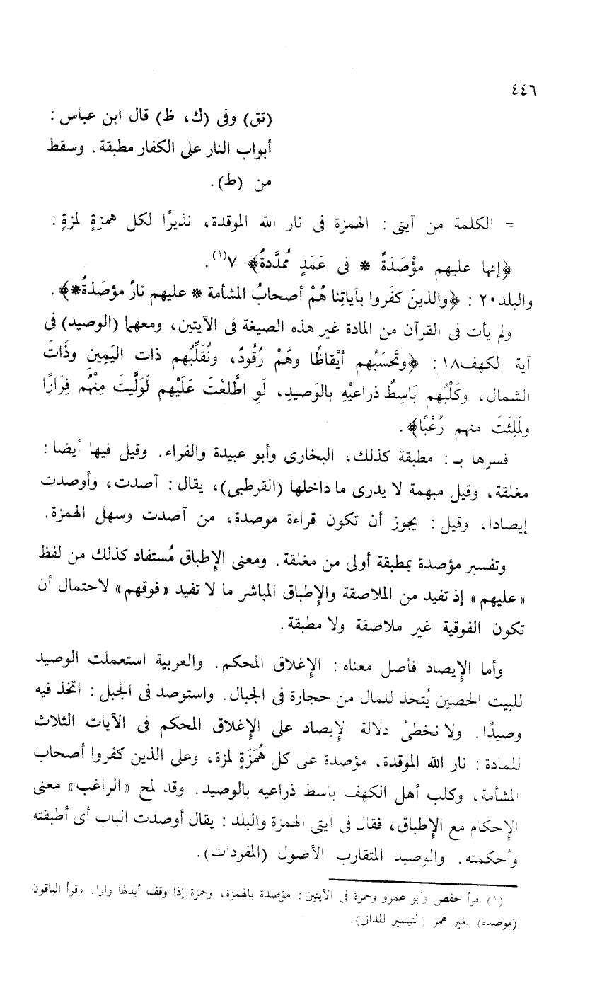 وأما الإيصاد فأصل معناه: الإغلاق المحكم. والعربية استعملت الوصيد للبيت الحصين يُتخذ للمال من حجارة في الجبال. واستوصد في الجبل: اتخذ فيه وصيداً. ولا نخطئ دلالة الإيصاد على الإغلاق المحكم في الآيات الثلاث للمادة: نار الله الموقدة، مؤصدة على كل هُمَزَةٍ لمزة، وعلى الذين كفروا أصحاب المشأمة، وكلب أهل الكهف باسط ذراعيه بالوصيد. وقد لمح "الراغب" معنى الإحكام مع الإطباق، فقال في آيتى الهمزة والبلد: يقال أوصدت الباب أي أطبقته وأحكمته. والوصيد المتقارب الأصول (المفردات)