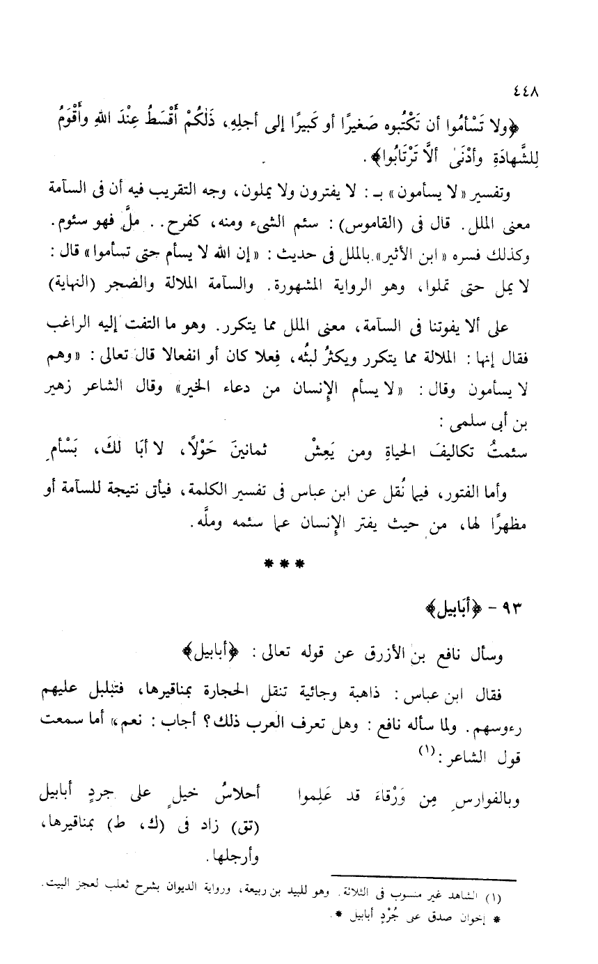 فقال ابن عباس: ذاهبة وجائية تنقل الحجارة بمنلقيرها، فتبلبل عليهم رءوسهم. ولما سأله نافع: وهل تعرف العرب ذلك؟ أجاب: نعم، أما سمعت قول الشاعر: