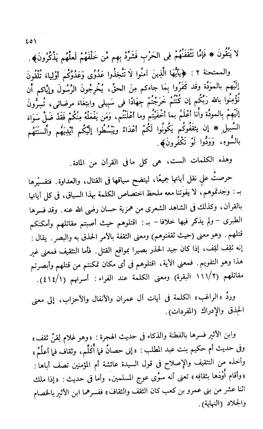 حرصتُ على نقل آياتها جميعاً، ليتضح سياقها في القتال، والعداوة. فتفسيُرها بـ: وجدتموهم، لا يفوتنا معه ملحظ اختصاص الكلمة بهذا السياق، في كل آياتها بالقرآن، وكذلك في الشاهد الشعري من همزية حسان - رضي الله عنه -. وقد فسرها الطبري - ولم يذكر فيها خلافاً - بـ: اقتلوهم حيث أصبتم مقاتلهم وأمكنكم قتلهم. وهو معنى {حَيْثُ ثَقِفْتُمُوهُمْ} ومعنى الثقفة بالأمر الحذق به والبصر. يقال: إنه تقِف لقِف. إذا كان جيد الحذر بصيراً بمواقع القتل. فأما التثقيف فمعنى غير هذا وهو التقويم. فمعنى الآية، اقتلوهم في أي مكان تمكنتم من قتلهم وأبصرتم مقاتلهم (2 / 111 البقرة) ومعنى الكلمة عند الفراء: اسرتهم (1 / 414)