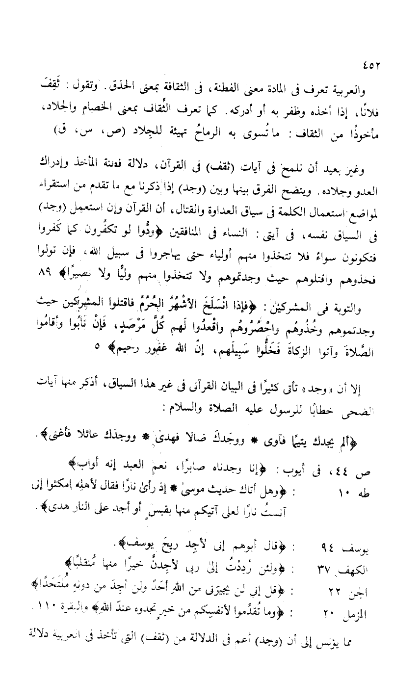 وغير بعيد أن نلمح في آيات (ثقف) في القرآن، دلالة فطنة المأخذ وإدراك العدو وجلاده. ويتضح الفرق بينها وبين (وجد) إذا ذكرنا مع ما تقدم من استقراء لمواضع استعمال الكلمة في سياق العداوة والقتال، أن القرآن وإن استعمل (وجد) في السياق نفسه، في آيتى: النساء في المنافقين {وَدُّوا لَوْ تَكْفُرُونَ كَمَا كَفَرُوا فَتَكُونُونَ سَوَاءً فَلَا تَتَّخِذُوا مِنْهُمْ أَوْلِيَاءَ حَتَّى يُهَاجِرُوا فِي سَبِيلِ اللَّهِ فَإِنْ تَوَلَّوْا فَخُذُوهُمْ وَاقْتُلُوهُمْ حَيْثُ وَجَدْتُمُوهُمْ وَلَا تَتَّخِذُوا مِنْهُمْ وَلِيًّا وَلَا نَصِيرًا} 89