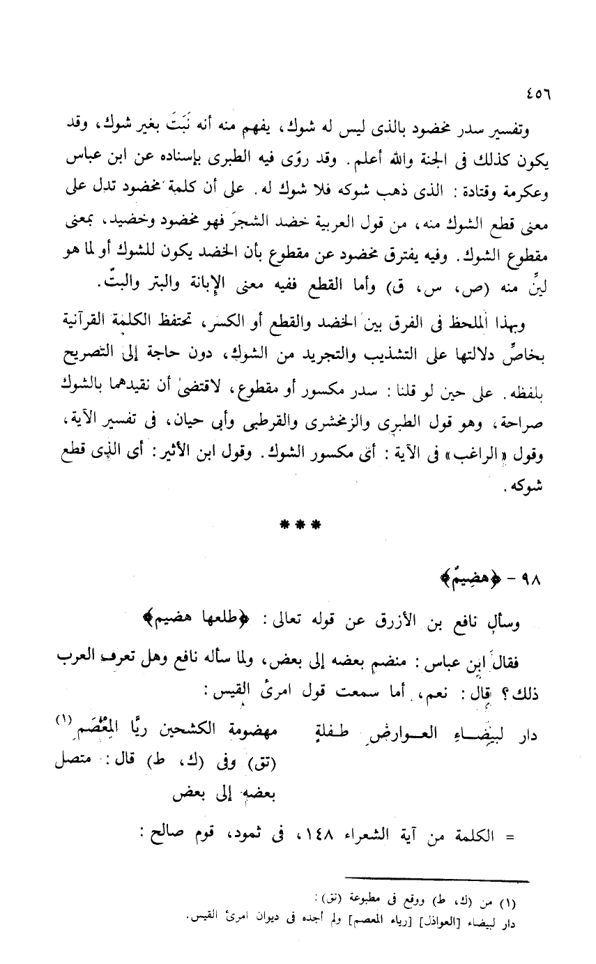 وبهذا الملحظ في الفرق بين الخضد والقطع أو الكسر. تحتفظ الكلمة القرآنية بخاصَّ دلالتها على التشذيب والتجريد من الشوك، دون حاجة إلى التصريح بلفظه. على حين لو قلنا: سدر مكسور أو مقطوع، لاقتضى أن نقيدهما بالشوك صراحة، وهو قول الطبري والزمخشري والقرطبي وأبي حيان، في تفسير الآية، وقول "الراغب" في الآية: أي مكسور الشوك. وقول ابن الأثير: أي الذي قطع شوكه.