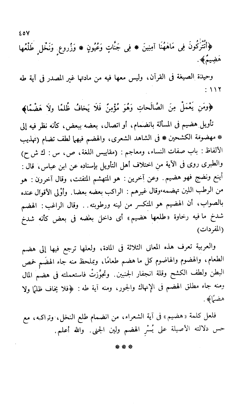 فلعل كلمة "هضيم" في آية الشعراء، من انضمام طلع النخل، وتراكبه، مع حس دلالته الأصلية على يُسْرِ الهضم ولين الجنى. والله أعلم.