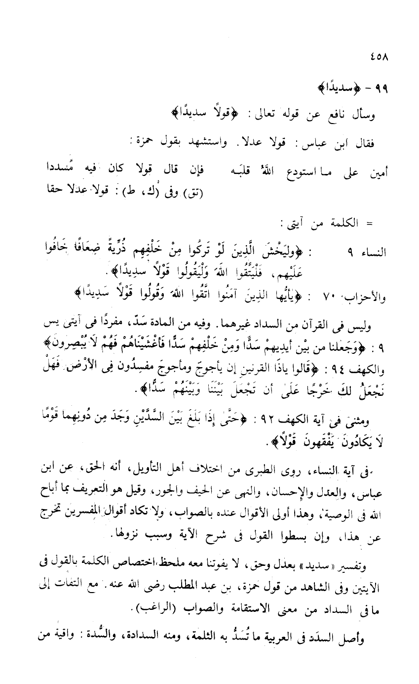 وتفسير "سديد" بعدل وحق، لا يفوتنا معه ملحظ اختصاص الكلمة بالقول في الآيتين وفي الشاهد من قول حمزة، بن عبد المطلب - رضي الله عنه -. مع التفات إلى ما في السداد من معنى الاستقامة والصواب (الراغب) .