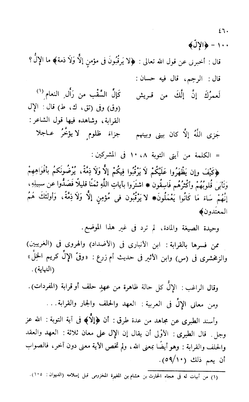 وأسند الطبري عن مجاهد من عدة طرق: أن {إِلًّا} في آية التوبة: الله - عز وجل -. قال الطبري: الأوْلى أن يقال إن الإِل على معان ثلاثة: العهد والعقد والحلف والقرابة: وهو أيضاً بمعنى الله، ولم تخص الآية معنى دون آخر، فالصواب أن يعم ذلك (10 / 59) .