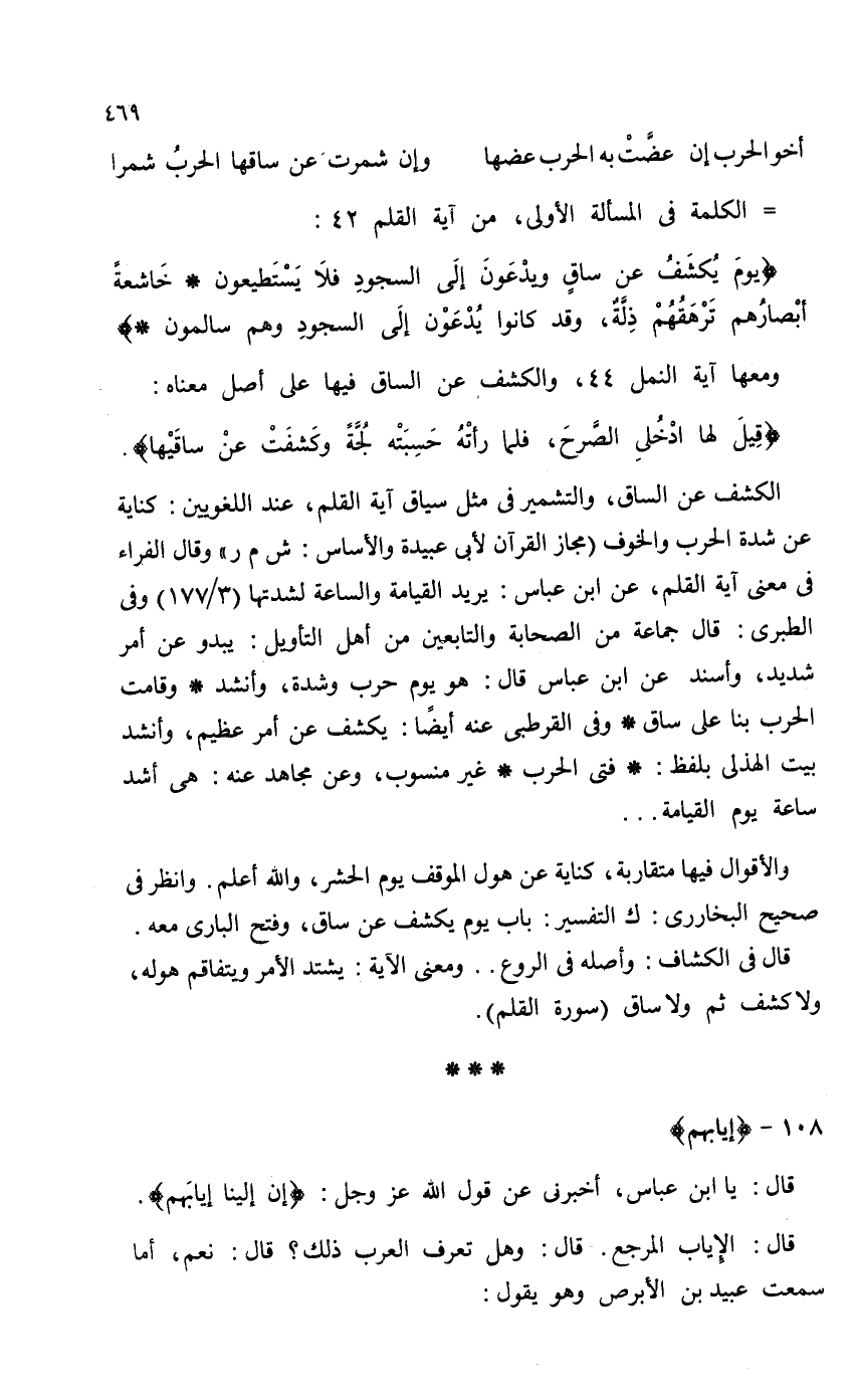 الكشف عن الساق، والتشمير في مثل سياق آية القلم، عند اللغويين: كناية عن شدة الحرب والخوف (مجاز القرآن لأبي عبيدة والأساس: ش م ر" وقال الفراء في معنى آية القلم، عن ابن عباس: يريد القيامة والساعة لشدتها (3 / 177) وفي الطبري: قال جماعة من الصحابة والتابعين من أهل التأويل: يبدو عن أمر شديد، وأسند عن ابن عباس قال: هو يوم حرب وشدة، وأنشد * وقامت الحرب بنا على ساق * وفي القرطبي عنه أيضاً: يكشف عن أمر عظيم، وأنشد بيت الهذلى بلفظ: * فتى الحرب * غير منسوب، وعن مجاهد عنه: هي أشد ساعة يوم القيامة. . .
