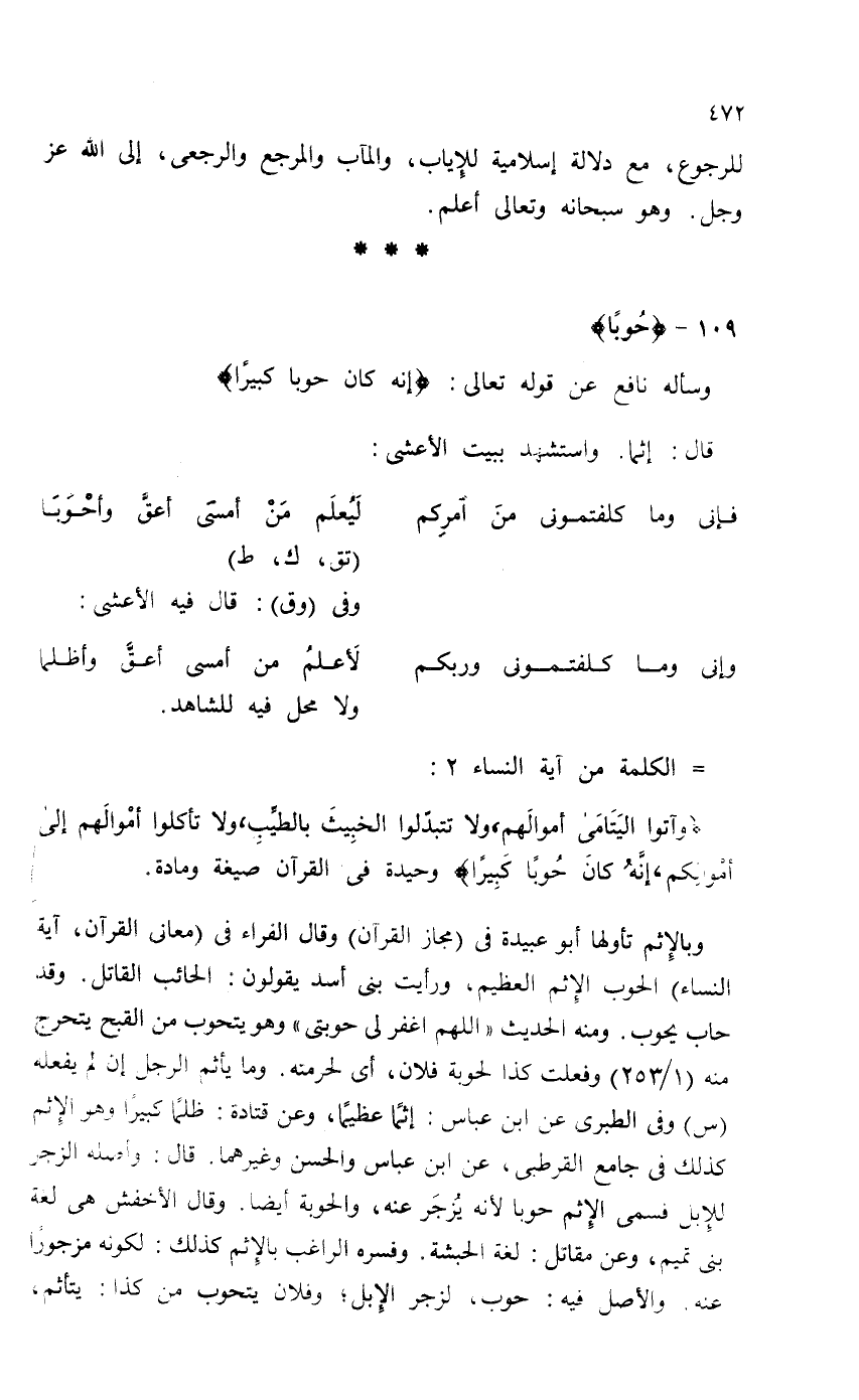 وباتلإثم تأولها أبو عبيدة في (مجاز القرآن) وقال الفراء في (معاني القرآن، آية النساء) الحوب الإثم العظيم، ورأيت بني أسد يقولون: الحائب القاتل. وقد حاب يحوب. ومن الحديث "اللهم اغفر لي حوبتي" وهو يتحوب من القبح يتحرج منه (1 / 253) وفعلت كذا لحوبة فلان، أي لحرمته. وما يأثم الرجل إن لم يفعله (س) وفي الطبري عن ابن عباس: إثماً عظيماً، وعن قتادة: ظلماً كبيراً وهو الإثم كذلك في جامع القرطبي، عن ابن عباس والحسن وغيرهما. قال: وأصله الزجر للإبل فسمي الإثم حوبا لأنه يُزجَر عنه، والحوبة أيضاً. وقال الأخفض هي لغة بني تميم، وعن مقاتل: لغة الحبشة. وفسره الراغب بالإثم كذلك: لكونه مزجوراً عنه. والأصل فيه: حوب، لزجر الإبل؛ وفلان يتحوب من كذا: يتأثم،