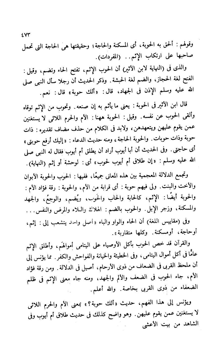 ويؤنس إلى هذا الفهم، حديث "ألك حوبة؟ " يمعنى الأم والحرم اللائي لا يستغنين عمن يقوم عليهن. وهو واضح كذلك في حديث طلاق أم أيوب وفي الشاهد من بيت الأعشى