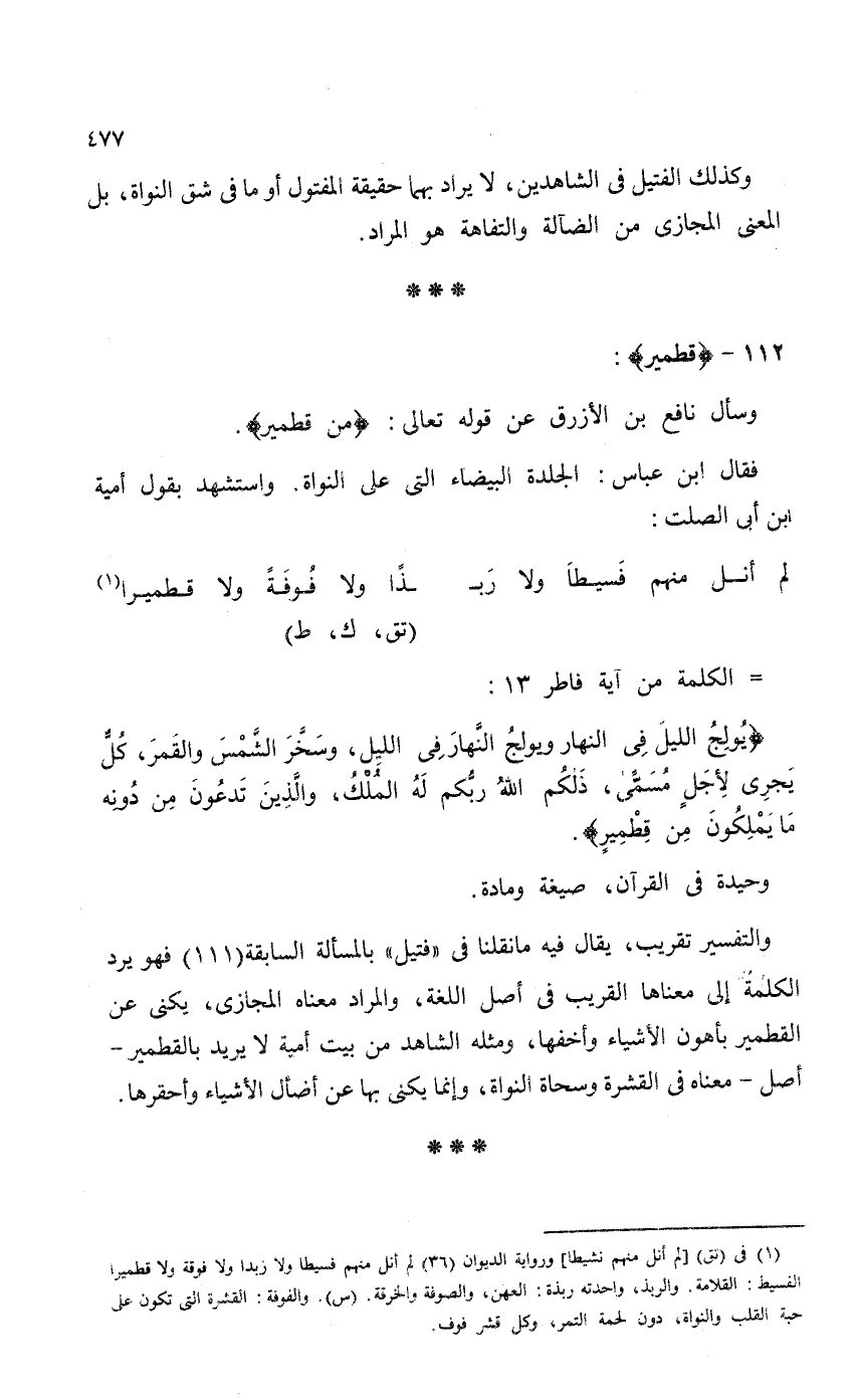 والتفسير تقريب، يقال فيه ما نقلنا في "فتيل" بالمسألة السابقة (111) فهو يرد الكلمة إلى معناها القريب في أصل اللغة، والمراد معناه المجازي، يكني عن القطمير بأهون الأشياء وأخفها، ومثله الشاهد من بيت أمية لا يريد بالقطمير - أصل - معناه في القشرة وسحاة النواة، وإنما يكني بها عن أضال الأشياء وأحقرها.