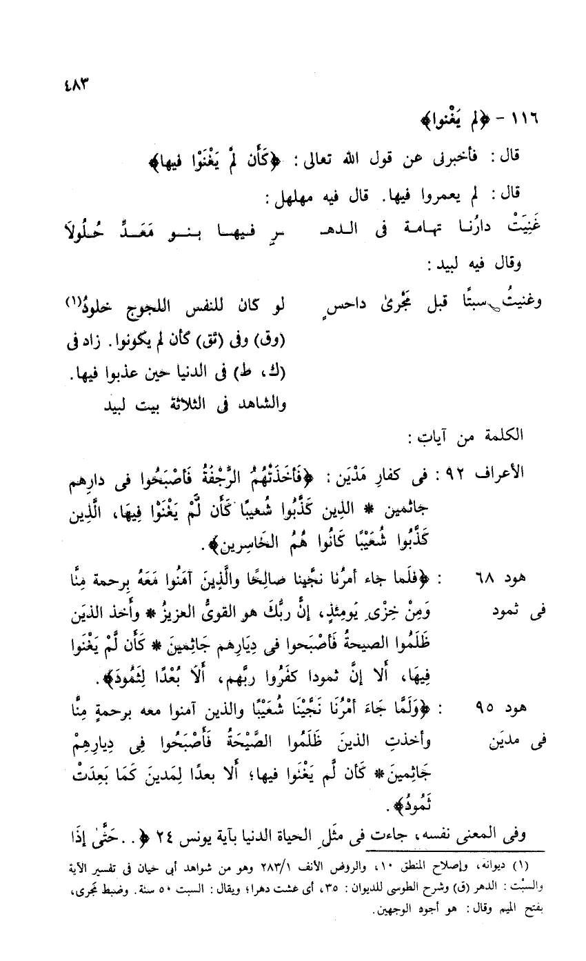 (وق) وفي (تق) كأن لم يكونوا. زاد في (ك، ط) في الدنيا حين عذبوا فيها. والشاهد في الثلاثة بيت لبيد.