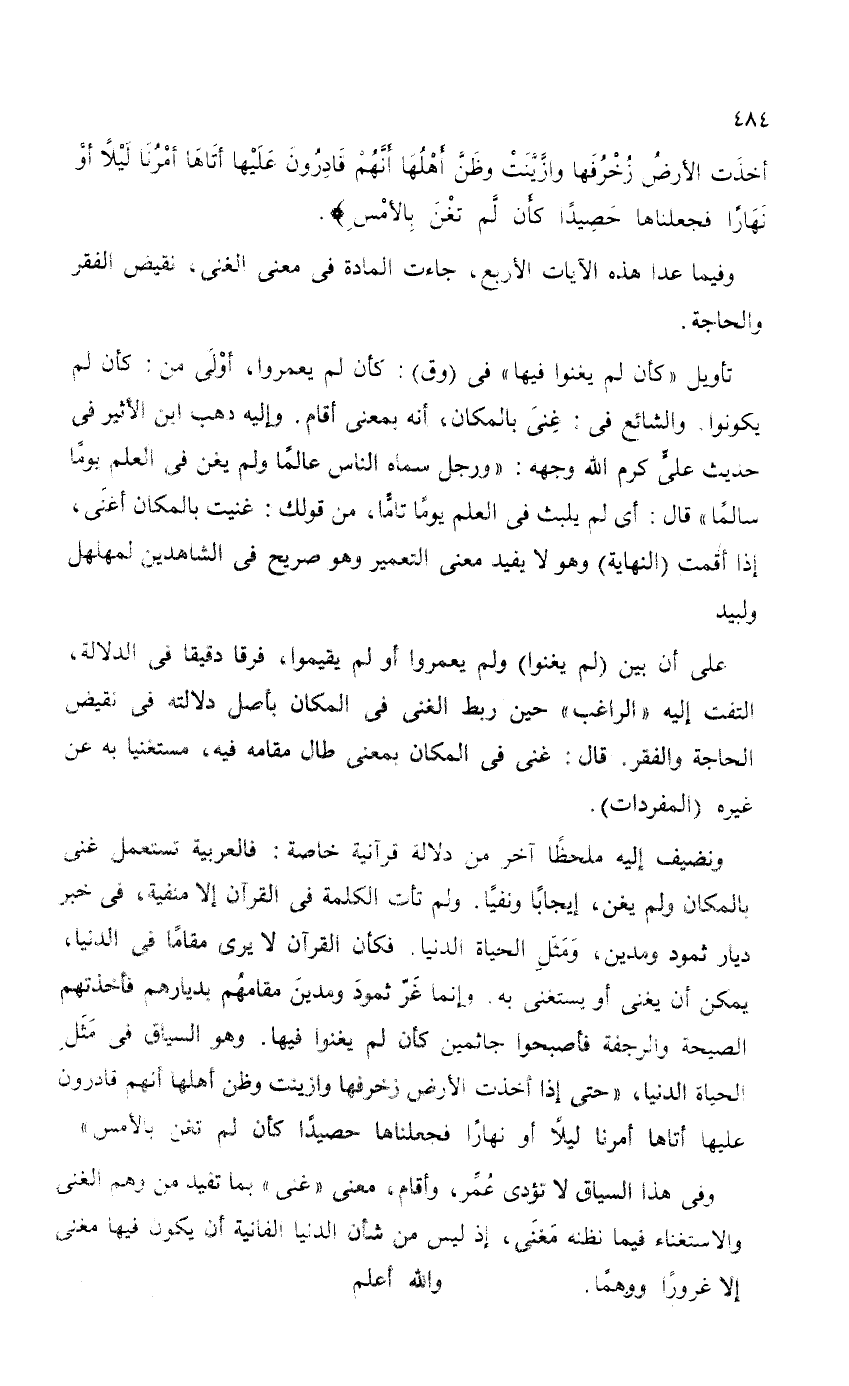 ونضيف إليه ملحظاً آخر من دلالة قرآنية خاصة: فالعربية تستعمل غنى بالمكان ولم يغن، إيجاباً ونفياً. ولم تأت الكلمة في القرآن إلا منفية، في خبر ديار ثمود ومدين، وَمَثَل الحياة الدنيا. فكأن القرآن لا يرى مقاماً في الدنيا، يمكن أن يغني أو يستغنى به، وإنما غَرّ ثمودَ ومدينَ مقامهُم بديارهم فأخذتهم الصيحة والرجفة فأصبحوا جاثمين كأن لم يغنوا فيها. وهو السياق في مَثَلِ الحياة الدنيا، {حَتَّى إِذَا أَخَذَتِ الْأَرْضُ زُخْرُفَهَا وَازَّيَّنَتْ وَظَنَّ أَهْلُهَا أَنَّهُمْ قَادِرُونَ عَلَيْهَا أَتَاهَا أَمْرُنَا لَيْلًا أَوْ نَهَارًا فَجَعَلْنَاهَا حَصِيدًا كَأَنْ لَمْ تَغْنَ بِالْأَمْسِ}