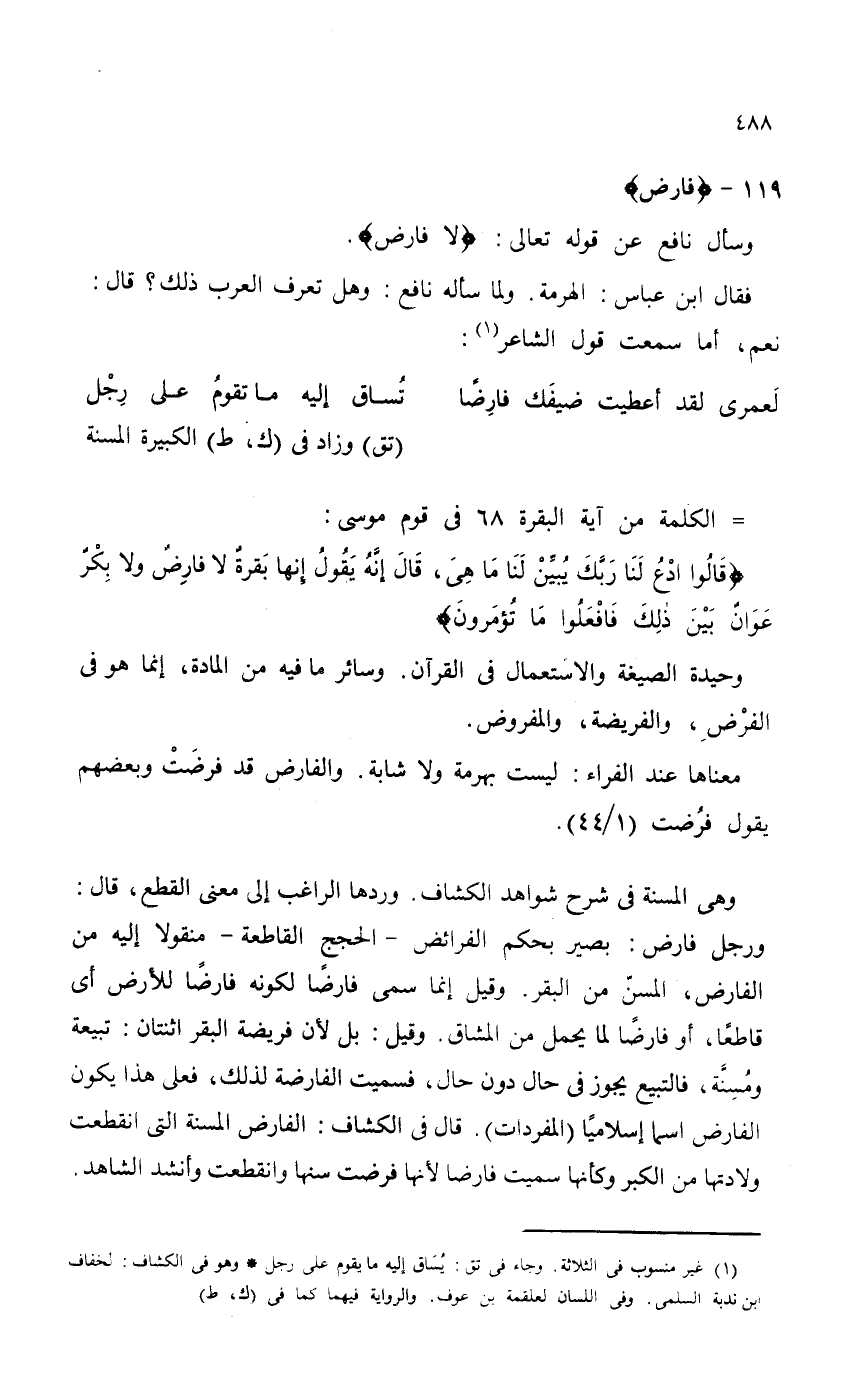 وهي المسنة في شرح شواهد الكشاف. وردها الراغب إلى معنى القطع، قال: ورجل فارض: بصير بحكم الفرائض - الحجج القاطعة - منقولاً إليه من الفارض: بصير بحكم الفرائض - الحجج القاطعة - منقولاً إليه من الفارض، المسنّ من البقر. وقيل إنما سمي فارضاً لكونه فارضاً للأرض أي قاطعاً، أو فارضاً لما يحمل من المشاق. وقيل: بل لأن فريضة البقر اثنتان: تبيعة ومُسِنَّة، فالتبيع يجوز في حال دون حال، فسميت الفارضة لذلك، فعل هذا يكون الفارض اسماً إسلامياً (المفردات) . قال في الكشاف: الفارض المسنة التي انقطعت ولادتها من الكبر وكأنها سميت فارضا لأنها فرضت سنها وانقطعت وأنشد الشاهد.