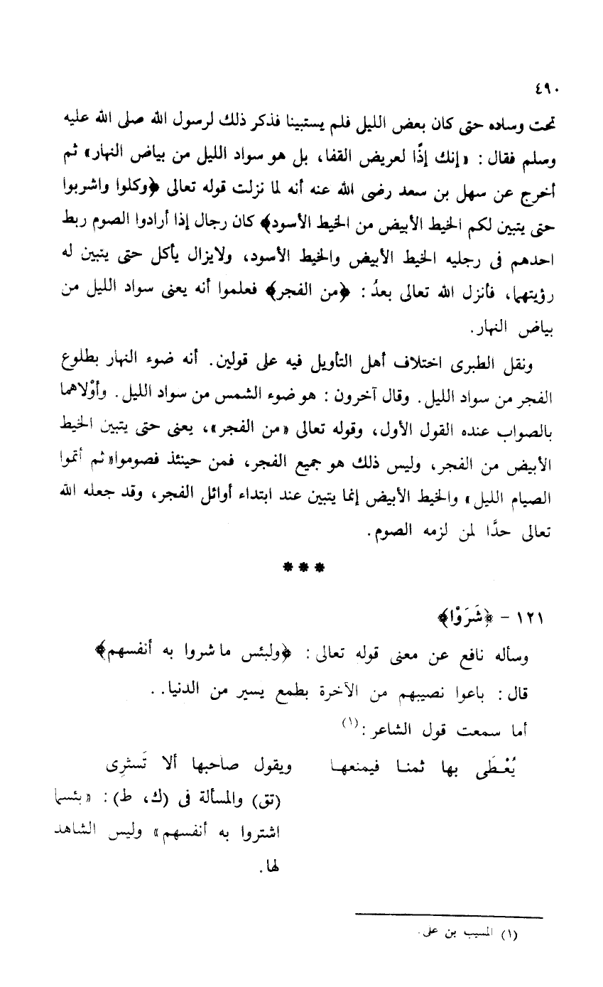 تحت وسادة حتى كان بعض الليل فلم يستبينا فذكر ذلك لرسول الله - صلى الله عليه وسلم - فقال: "إنك أذاً لعريض القفا، بل هو سواد الليل من بياض النهار" ثم أخرج عن سهل بن سعد - رضي الله عنه - أنه لما نزلت قوله تعالى {وَكُلُوا وَاشْرَبُوا حَتَّى يَتَبَيَّنَ لَكُمُ الْخَيْطُ الْأَبْيَضُ مِنَ الْخَيْطِ الْأَسْوَدِ} كان رجال إذا أرادوا الصوم ربط احدهم في رجليه الخيط الأبيض والخيط الأسود، ولا يزال يأكل حتى يتبين له رؤيتهما، فأنزل الله تعالى بعدُ: {مِنَ الْفَجْرِ} فعلموا أنه يعني سواد الليل من بياض النهار.