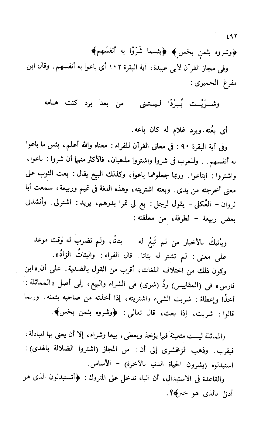 وفي آية البقرة 90: في معاني تالقرآن للفراء: معناه والله أعلم، بئس ما باعوا به أنفسهم. . . وللعرب في شروا واشتروا مذهبان، فالأكثر منهما أن شروا: باعوا، واشتروا: ابتاعوا. وربما جعلوهما باعوا، وكذلك البيع يقال: بعت الثوب على معنى أخرجته من يدي. وبعته اشتريته، وهذه اللغة في تميم وربيعة، سمعت أبا ثروان - العُكلى - يقول لرجل: بع لي تمرا بدرهم، يريد: اشترلى. وأنشدني بعض ربيعة - لطرفة، من معلقته: