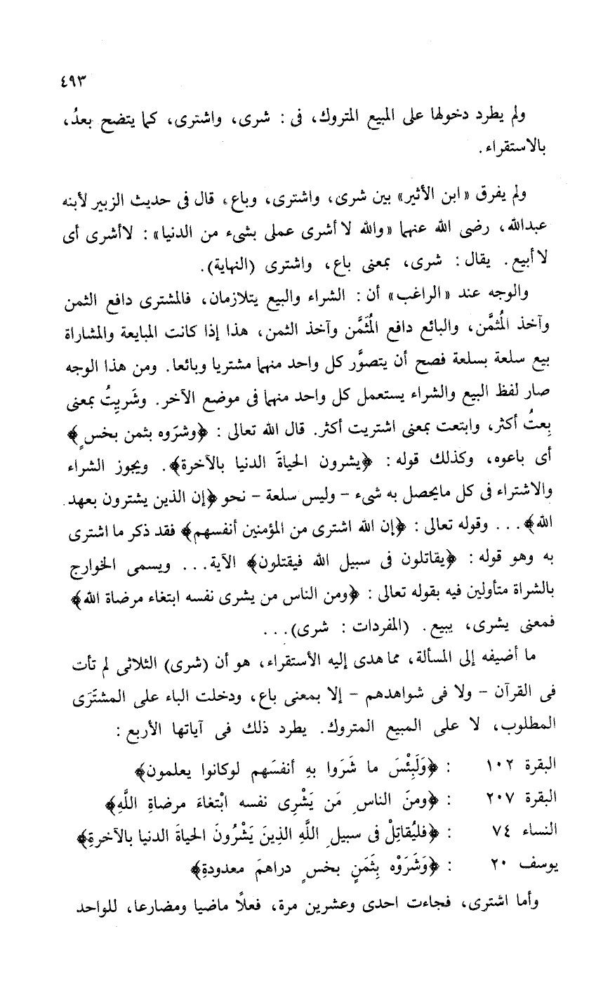 ما أضيفه إلى المسألة، مما هدى إليه الأستقراء، هو أن (شرى) الثلاثي لم تأت في القرآن - ولا في شواهدهم - إلا بمعنى باع، ودخلت الباء على المشتَرَى المطلوب، لا على المبيع المتروك. يطرد ذلك في آياتها الأربع: