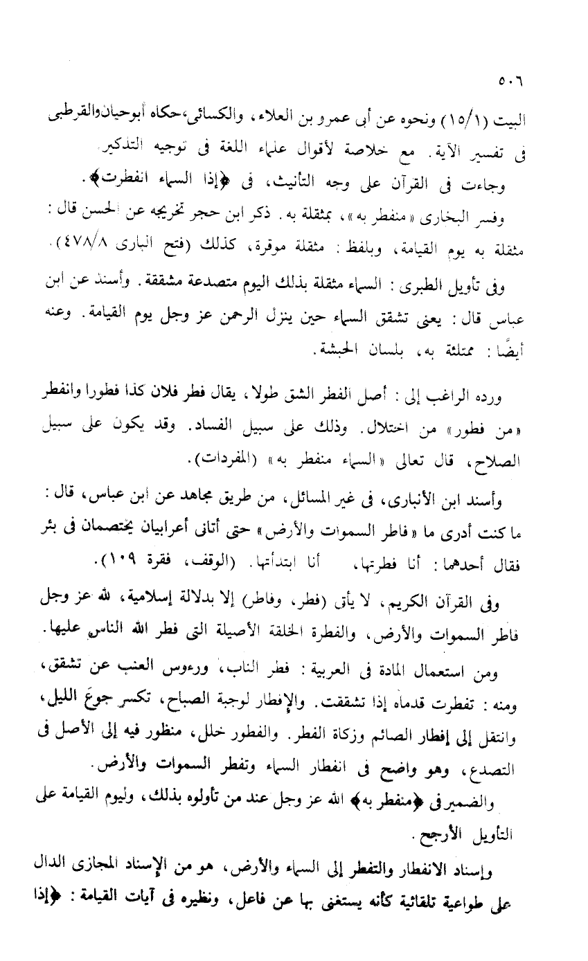 وأسند ابن الأنباري، في غير المسائل، من طريق مجاهد عن ابن عباس، قال: ما كنت أدري ما {فَاطِرِ السَّمَاوَاتِ وَالْأَرْضِ} حتى أتاني أعهرابيان يختصمان في بئر فقال أحدهما: أنا فطرتها، أنا ابتدأتها. (الوقف، فقرة 109) .