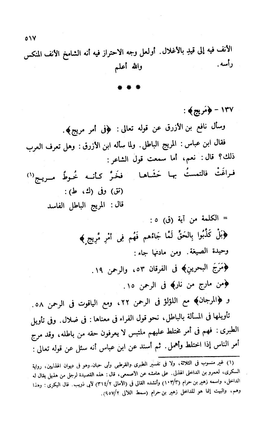 فقال ابن عباس: المريج الباطل. ولما سأله ابن الأزرق: وهل تعرف العرب ذلك؟ قال: نعم، أما سمعت قول الشاعر:
