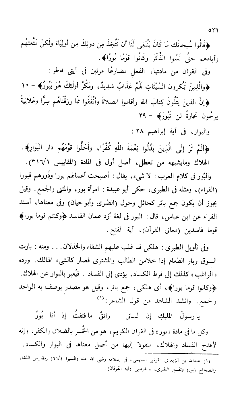 والبوُر في كلام العرب: لا شيء، يقال: أصبحت أعمالهم بورا ودُورهم قبورا (الفراء) ، ومثله في الطبري، حكى أبو عبيدة: امرأة بور، والمثنى والجمع. وقيل يجوز أن يكون جمع بائر كحائل وحول (الطبري وأبو حيان) وفي معناها، أسند الفراء عن ابن عباس، قال: البور في لغة أزد عمان الفاسد {وَكُنْتُمْ قَوْمًا بُورًا} قوماً فاسدين (معاني القرآن) ، آية الفتح.