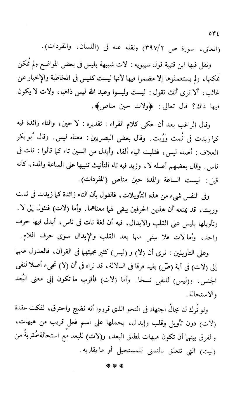 وفي النفس شيء من هذه التأويلات، فالقول بأن التاء زائدة كما زيدت في ثمت وربت، قد يمنعه أن هذين الحرفين يبقى لهما معناهما. وأما (لات) فتئول إلى لا. وتأويلها بليس على القلب والابدال، فيه أن لغة نات في ناس، أبدل فيها حرف واحد، وأما لات فلا يبقى منها بعد القلب والإبدال سوى حرف اللام.