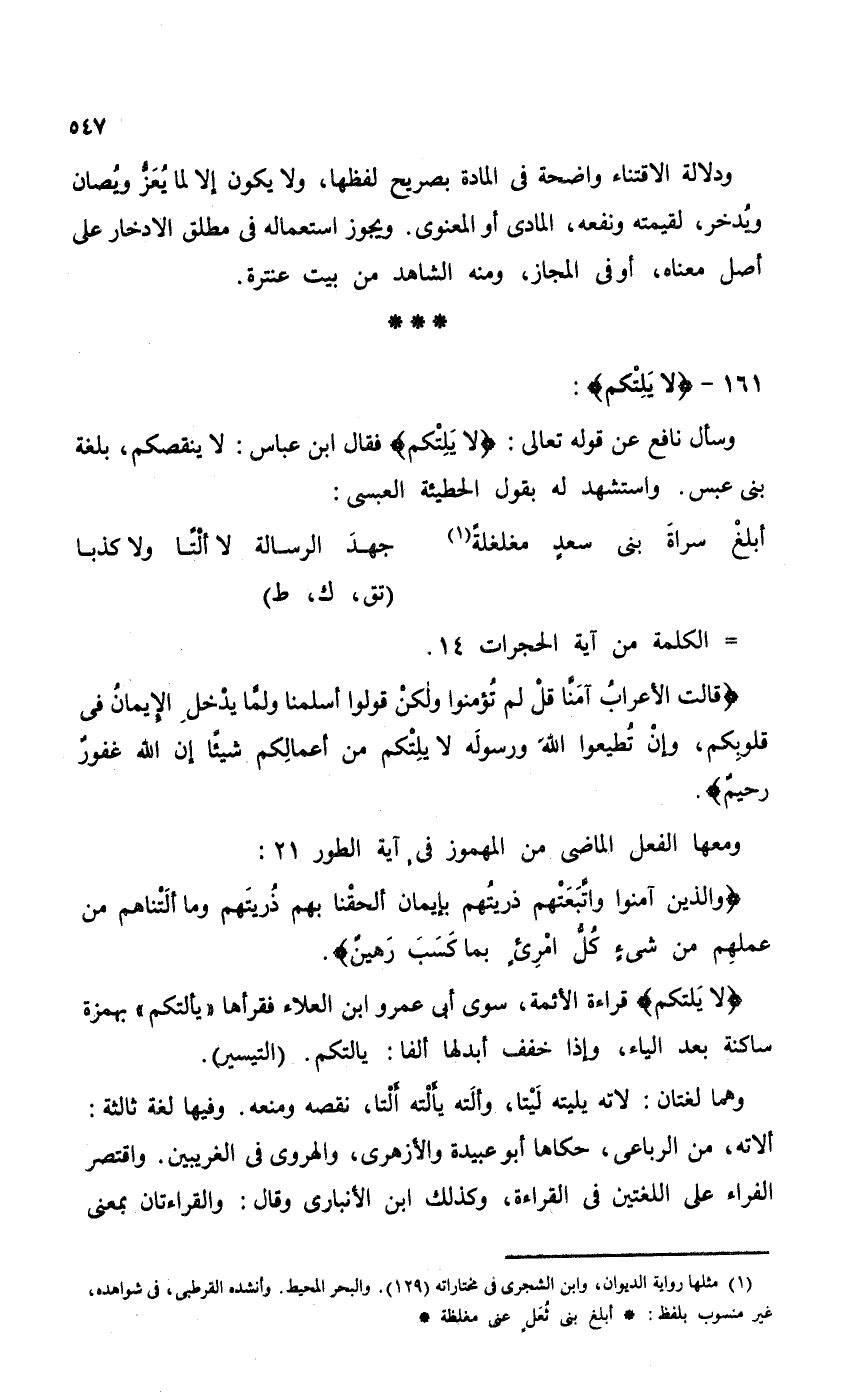 وسأل نافع عن قوله تعالى: {لَا يَلِتْكُمْ} فقال ابن عباس: لا ينقصكم، بلغة بني عبس. واستشهد له بقول الحطيئة العبسى: