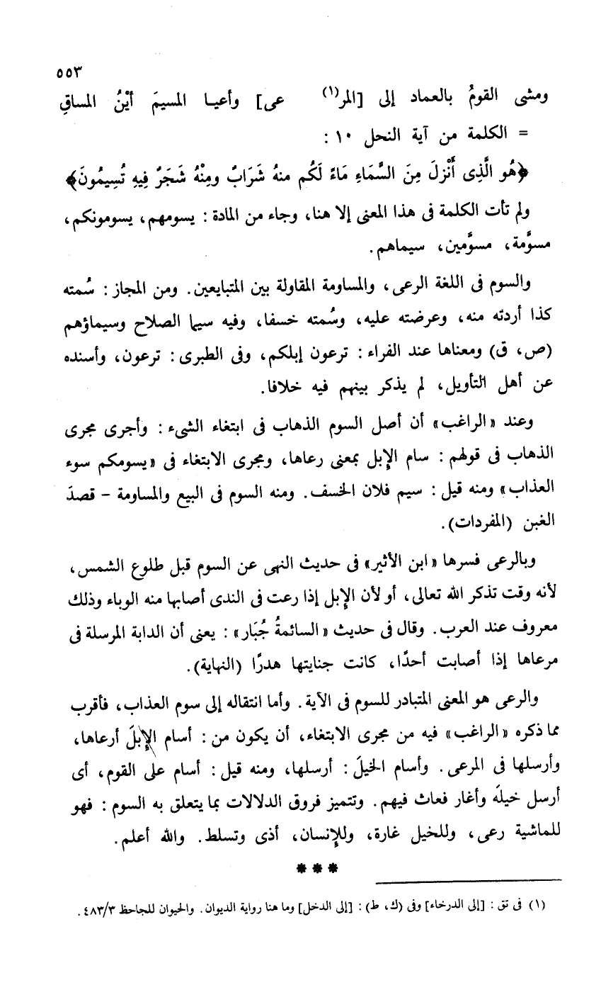 والرعي هو المعنى المتبادر للسوم في الآية. وأما انتقاله إلى سوم العذاب، فأقرب مما ذكره "الراغب" فيه من مجرى الابتغاء، أن يكون من: أسام الإبلَ أرعاها، وأرسلها في المرعى. واسام الخيلَ: أرسلها، ومنه قيل: أسام على القوم، أي أرسل خيلهَ وأغار فعاث فيهم. وتتميز فروق الدلالات بما يتعلق به السوم: فهو للماشية رعي، وللخيل غارة، وللإنسان، أذى وتسلط. والله أعلم.