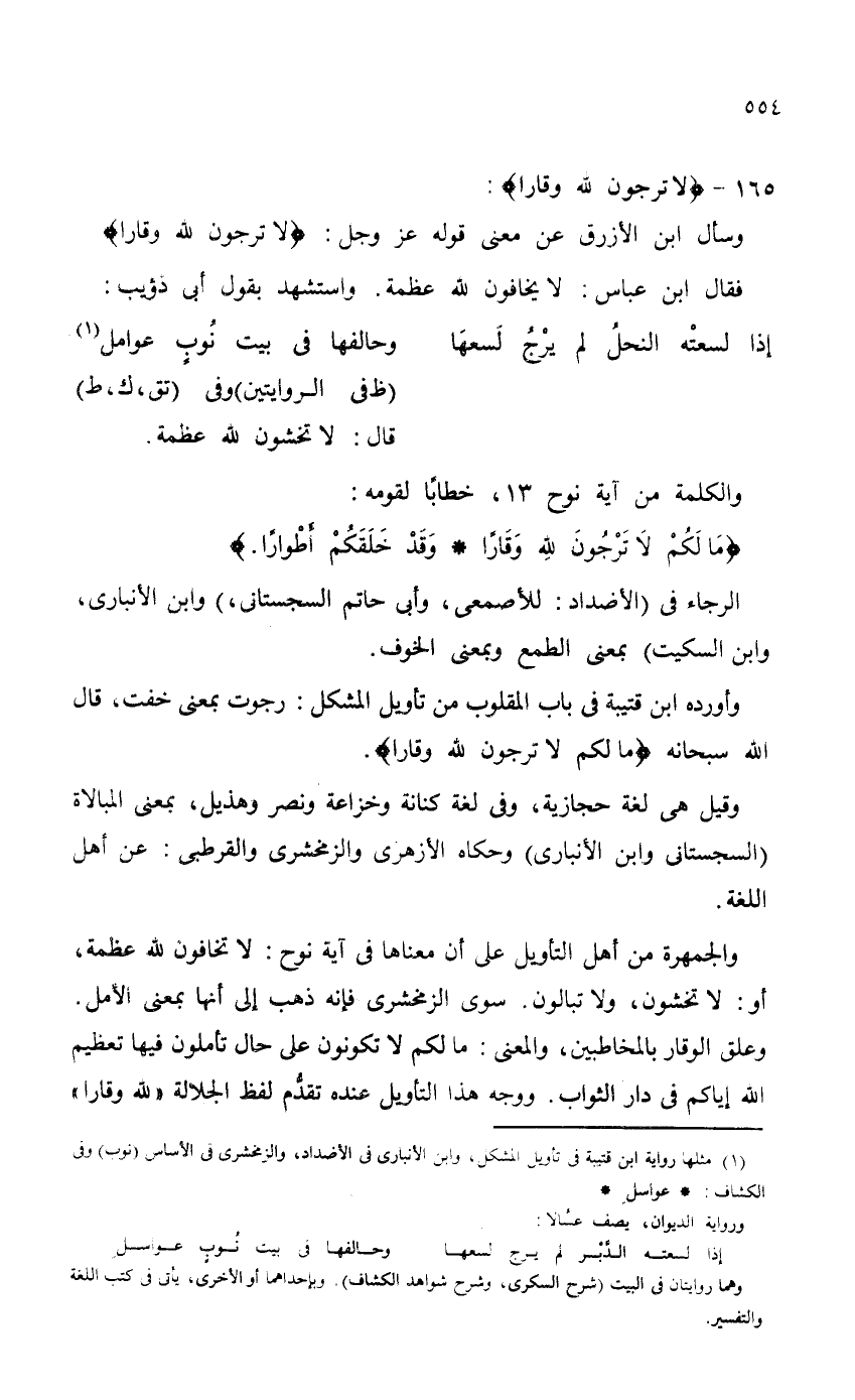 فقال ابن عباس: لا يخافون لله عظمة. واستشهد بقول أبي ذؤيب: