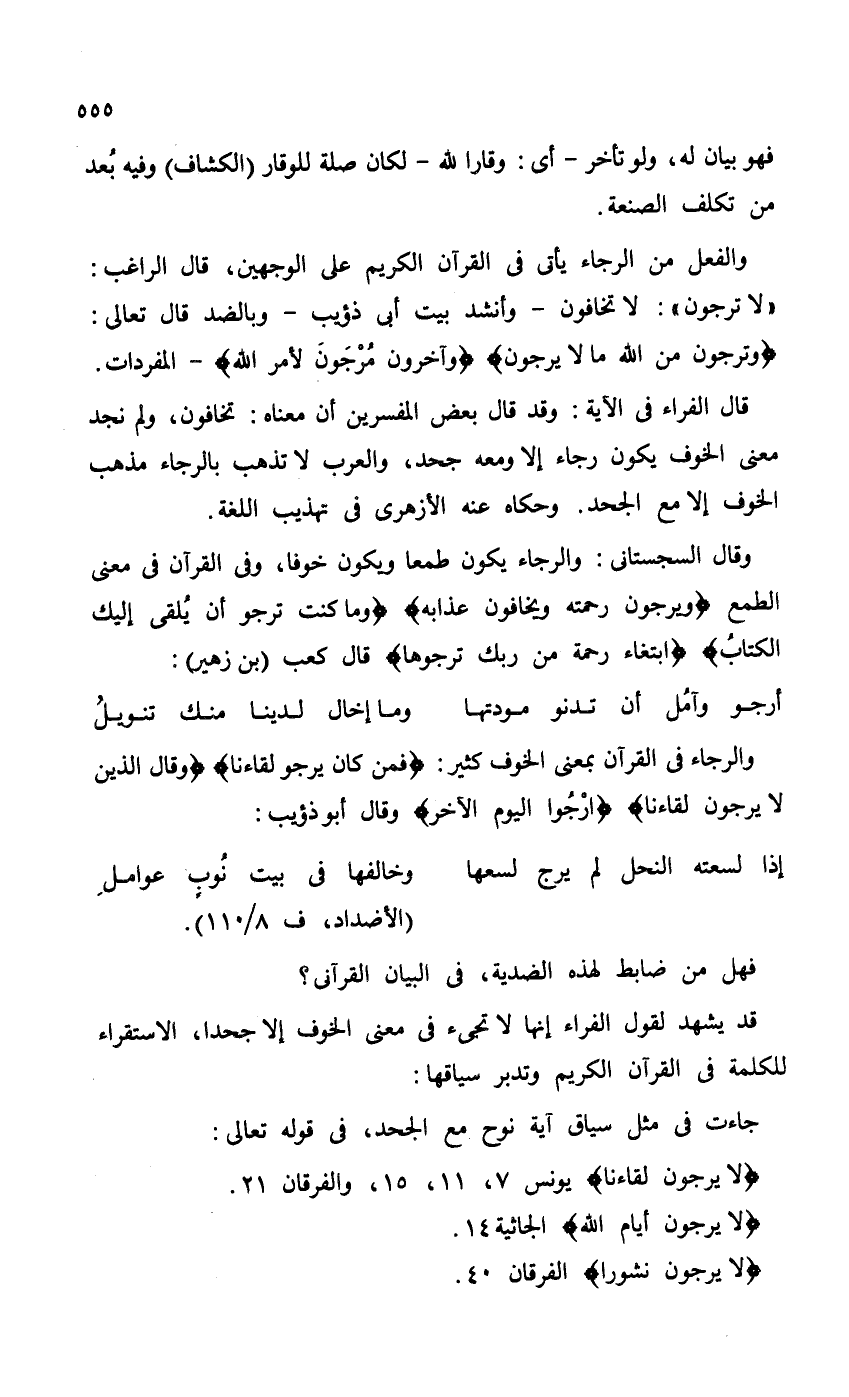 والفعل من الرجاء يأتي في القرآن الكريم على الوجهين، قال الراغب: {لَا تَرْجُونَ} : لا تخافون - وأنشد بيت أبي ذؤيب - وبالضد قال تعالى: {وَتَرْجُونَ مِنَ اللَّهِ مَا لَا يَرْجُونَ} {وَآخَرُونَ مُرْجَوْنَ لِأَمْرِ اللَّهِ} - المفردات.