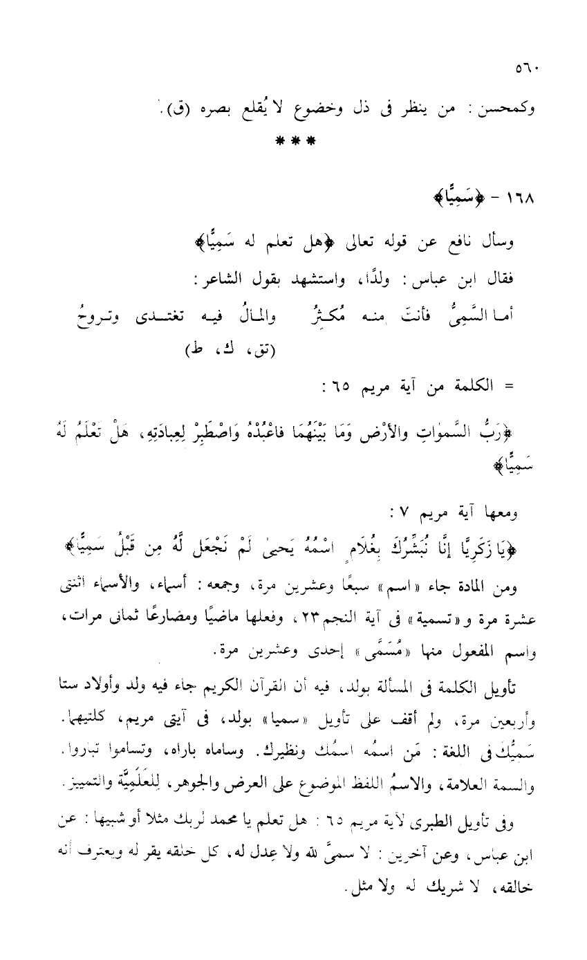 تأويل الكلمة في المسألة بولد، فيه أن القرآن الكريم جاء فيه ولد وأولاد ستا وأربعين مرة، ولم اقف على تأويل "سميا" بولد، في آيتى مريم، كلتيهما. سَمِيُّكَ في اللغة: مَن اسمُه اسمُك ونظيرك. وساماه باراه، وتساموا تباروا. والسمة العلامة، والاسمُ اللفظ الموضوع على العرض والجوهر، للِعَلَمِيَّة والتمييز.