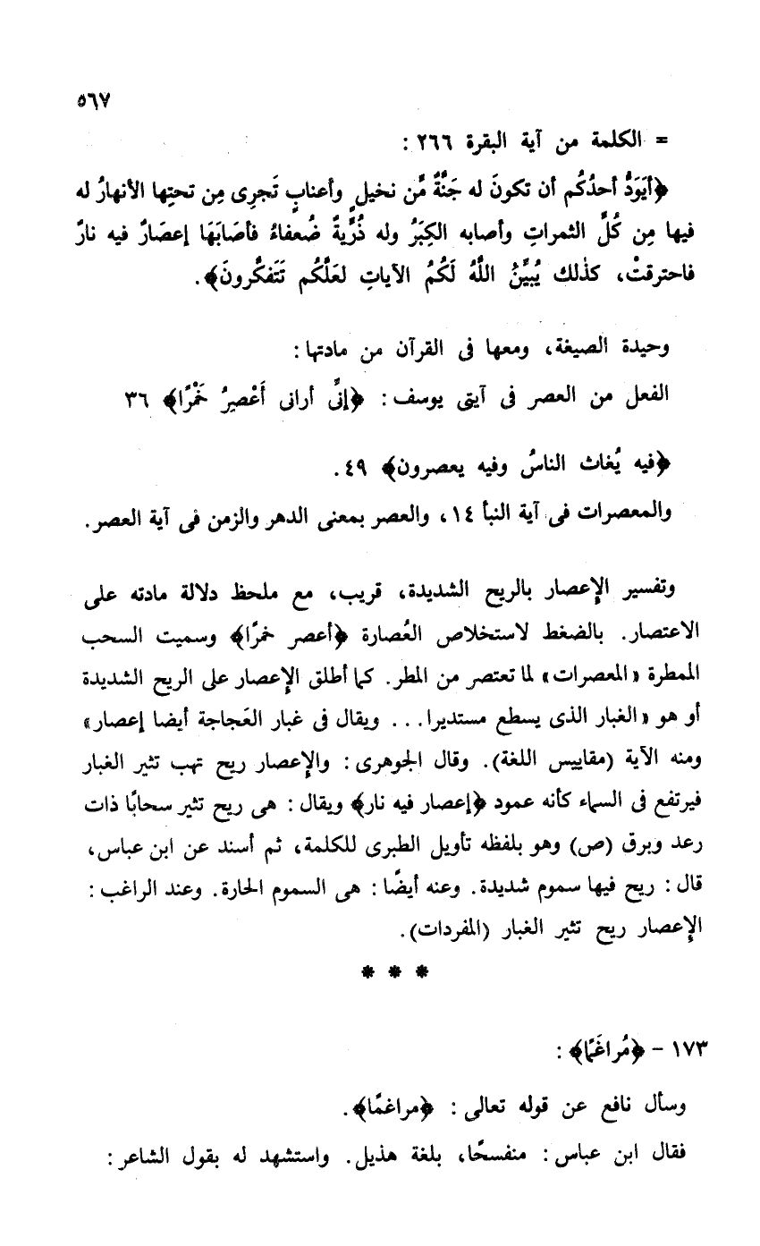 (أَيَوَدُّ أَحَدُكُمْ أَنْ تَكُونَ لَهُ جَنَّةٌ مِنْ نَخِيلٍ وَأَعْنَابٍ تَجْرِي مِنْ تَحْتِهَا الْأَنْهَارُ لَهُ فِيهَا مِنْ كُلِّ الثَّمَرَاتِ وَأَصَابَهُ الْكِبَرُ وَلَهُ ذُرِّيَّةٌ ضُعَفَاءُ فَأَصَابَهَا إِعْصَارٌ فِيهِ نَارٌ فَاحْتَرَقَتْ كَذَلِكَ يُبَيِّنُ اللَّهُ لَكُمُ الْآيَاتِ لَعَلَّكُمْ تَتَفَكَّرُونَ (266) .