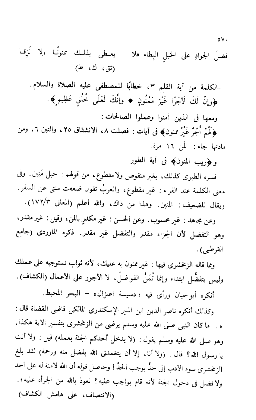 ومما قاله الزمخشري فيها:. غير ممنون به عليك، لأنه ثواب تستوجبه على عملك وليس بتفضل ابتداء وإنما تُمَنُّ الفواضل، لا الأجور على الأعمال (الكشاف) .