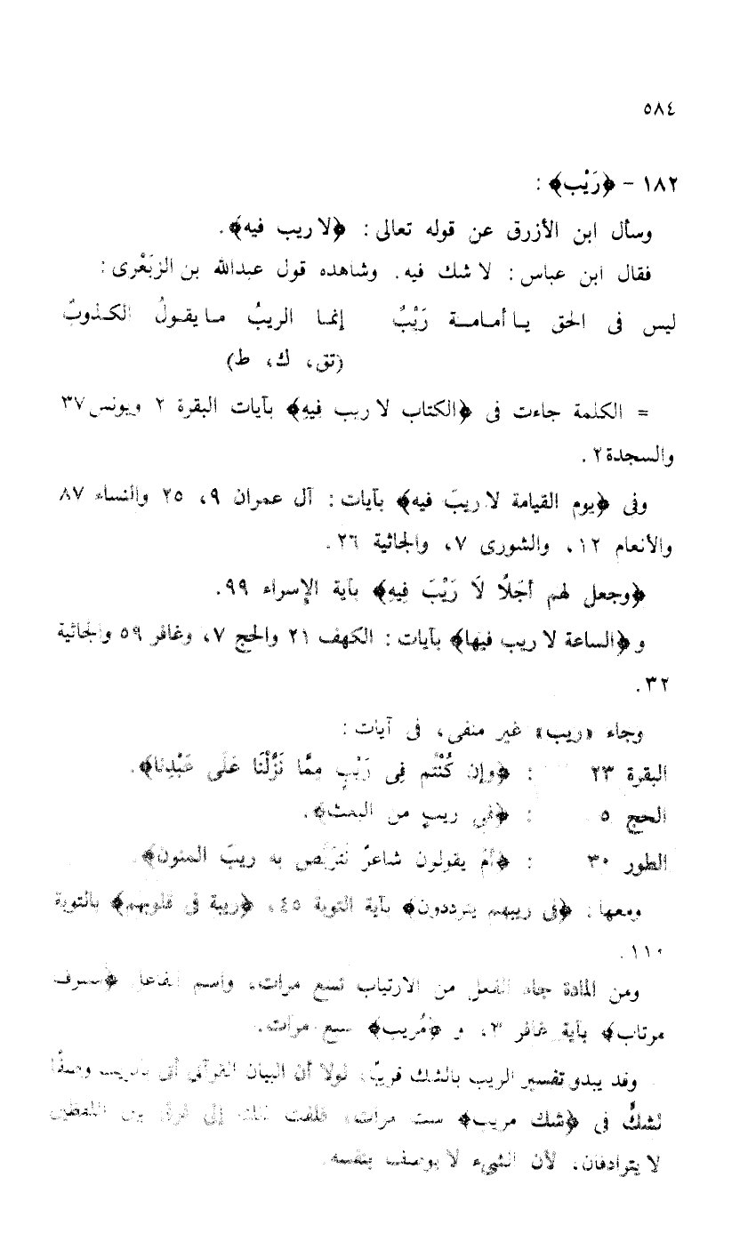 وسأل ابن الأزرق عن قوله تعالى: (لا ريب فيه) .