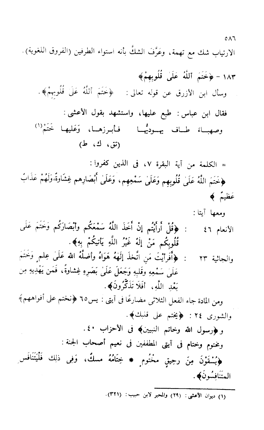 فقال ابن عباس: طبع عليها، واستشهد بقول الأعشى: